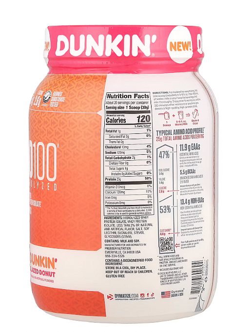 DUNKIN GLAZED DONUT INGREDIENTS: Hydrolyzed whey protein isolate, whey protein isolate. less than 2% of: natural and artificial flavor, salt, soy lecithin, sucralose, steviol glycosides (stevia).