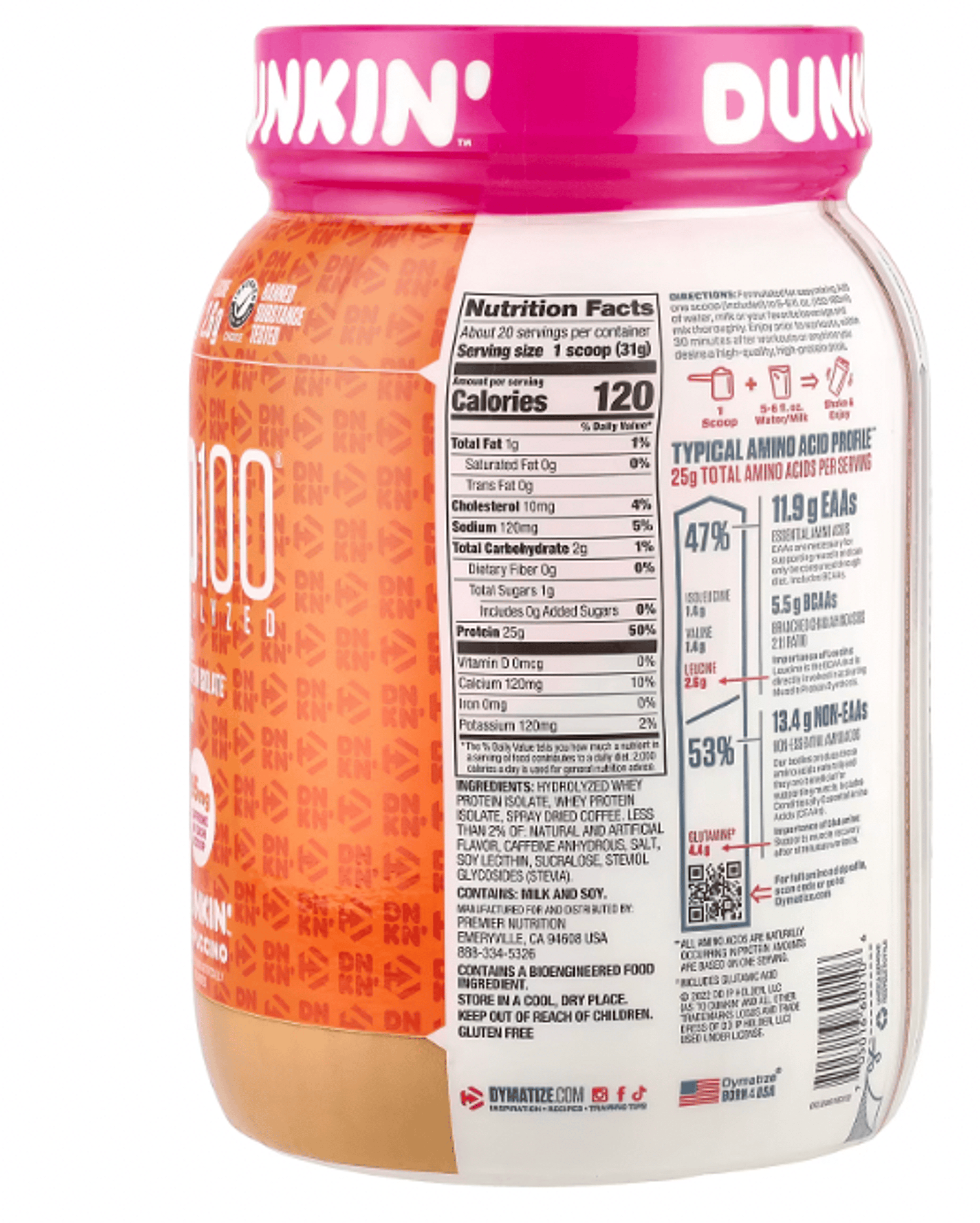 DUNKIN CAPPACINO INGREDIENTS - Hydrolyzed whey protein isolate, whey protein isolate, spray dried coffee. less than 2% of: natural and artificial flavor, caffeine anhydrous, salt, soy lecithin, sucralose, steviol glycosides (stevia).