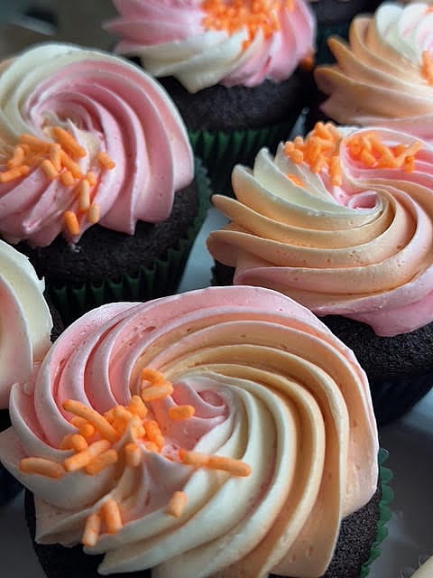 Chocolate cake topped with Vanilla bean frosting and sprinkles.