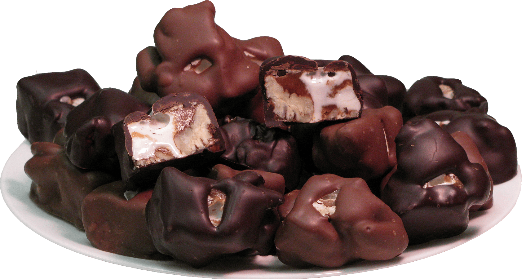 Nougat and caramel, cooked fresh in a copper kettle, combined with pecans and dipped in chocolate. Available in milk or dark chocolate. This is a specialty from way back.