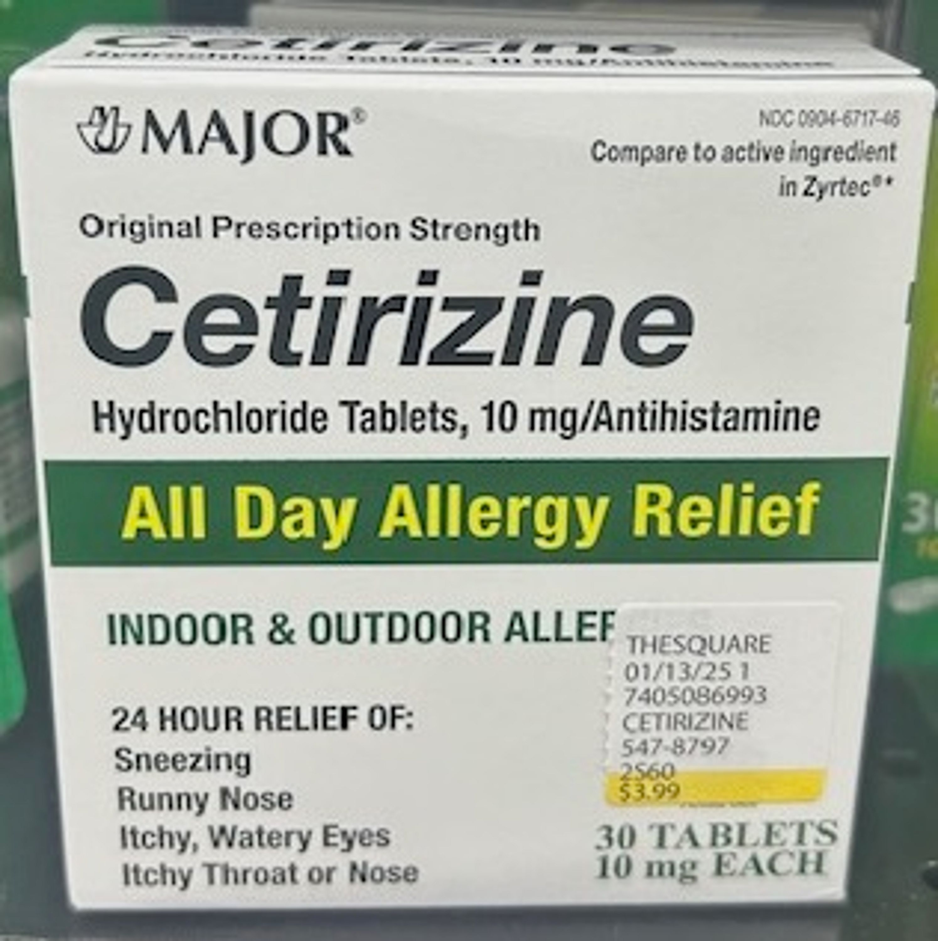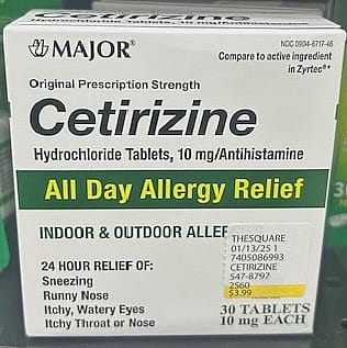 - 24 hour relief - 10mg tablets Uses: temporarily relieves these symptoms due to hay fever or other upper respiratory allergies: • runny nose • sneezing • itchy, watery eyes • itching of the nose or throat