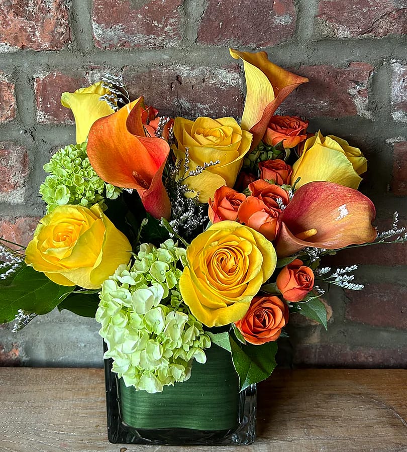 A festive floral arrangement of bright yellow roses, orange spray roses, mango calla lilies, and green hydrangea. Mango Fest is perfect for any occasion requiring bright and bold blooms that light up any room.