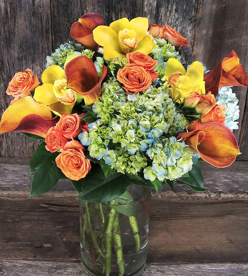 The Ibiza Sun floral display features blue hydrangea, mango calla lilies, orange spray roses, yellow cymbidium orchids arranged in a cylinder vase.
