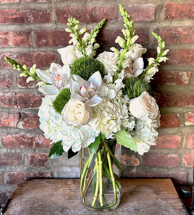Big Sky features white hydrangea, white cymbidium orchids, white roses, and white snapgragon and green dianthus arranged in a cylinder vase.