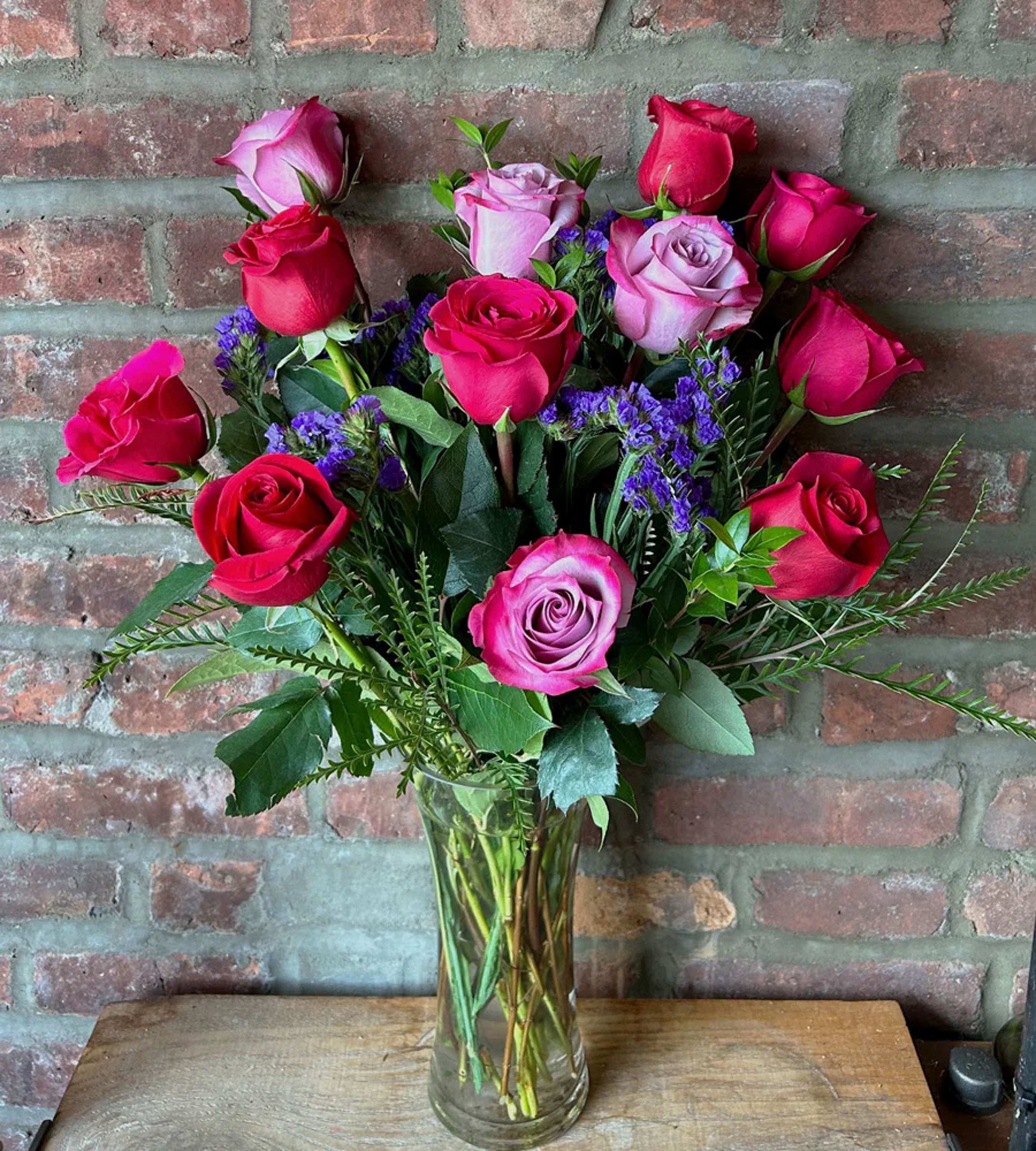 Dozen Multi Colored Roses in bold Jewel toned hues - hot pink, red and lavender. These vivacious roses are arranged with seasonal greenery in a clear glass vase.
