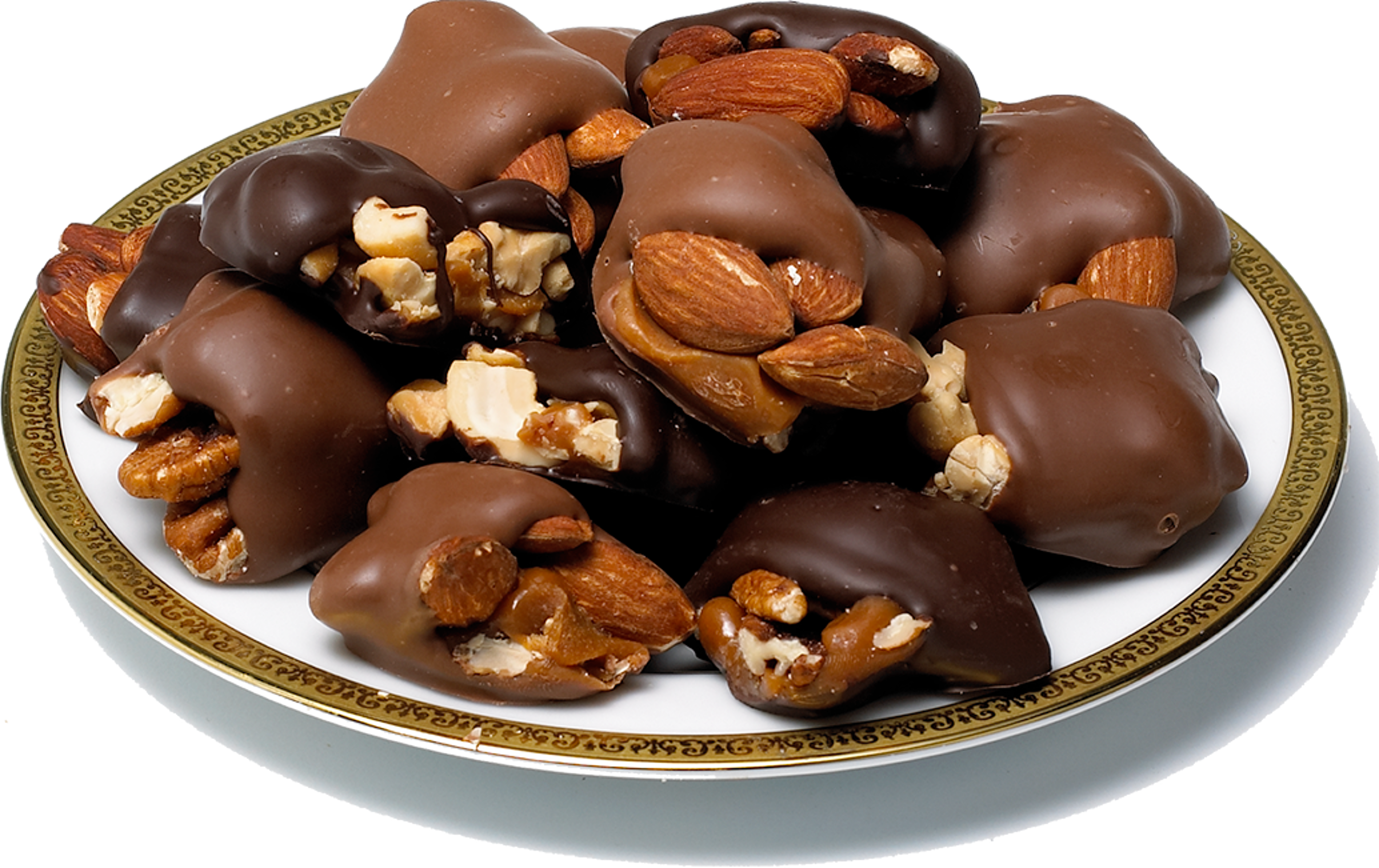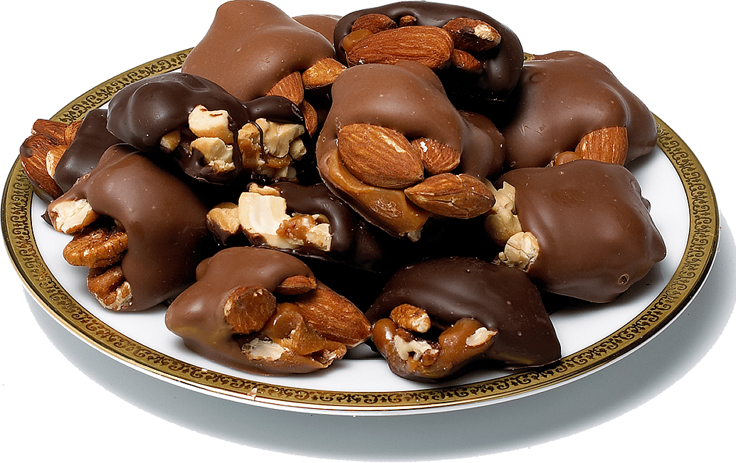 Crunchy almonds, Georgia pecans and scrumptious cashews in chewy caramel. Dipped in milk or semisweet dark chocolate.