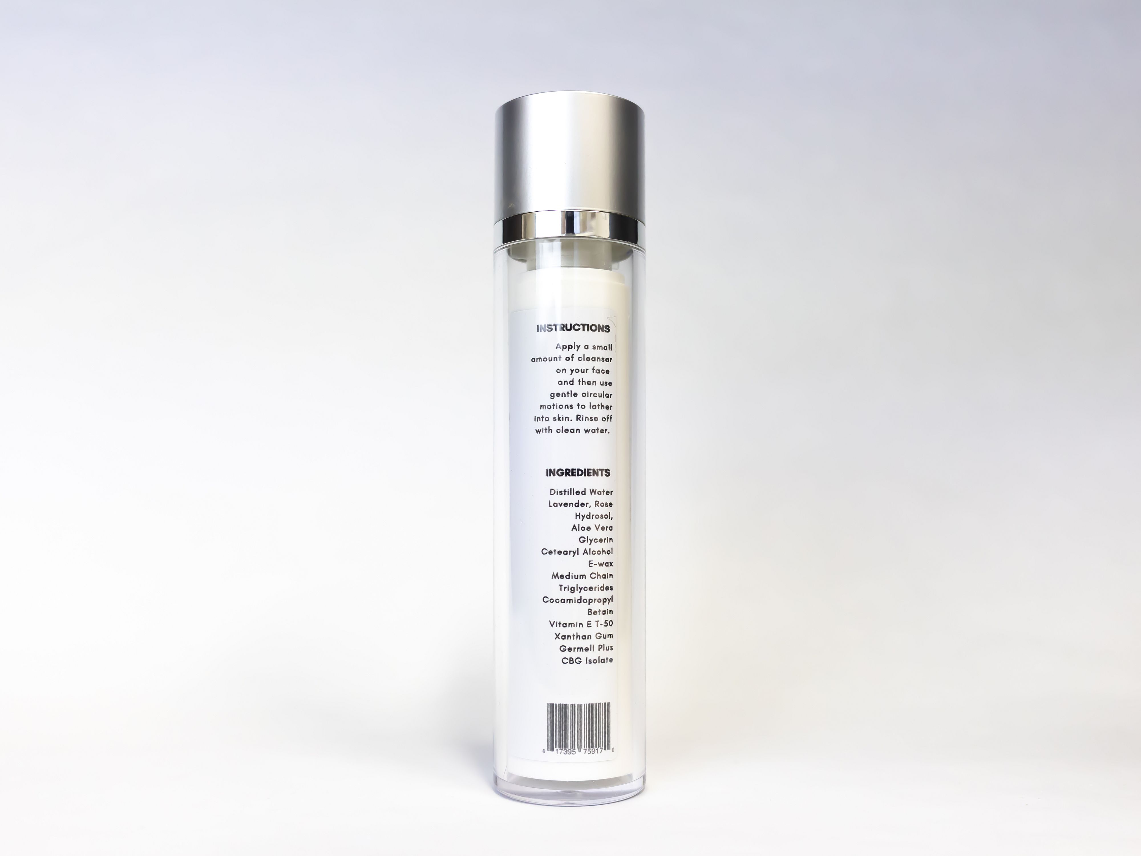 Ingredients: Distilled Water, Lavender, Rose Hydrosol, Aloe Vera, Glycerin, Cetearyl Alcohol, E-wax, Medium Chain Triglycerides, Cocamidopropyl Betain, Vitamin E T-50, Xanthan Gum, Germell Plus, CBG Isolate.