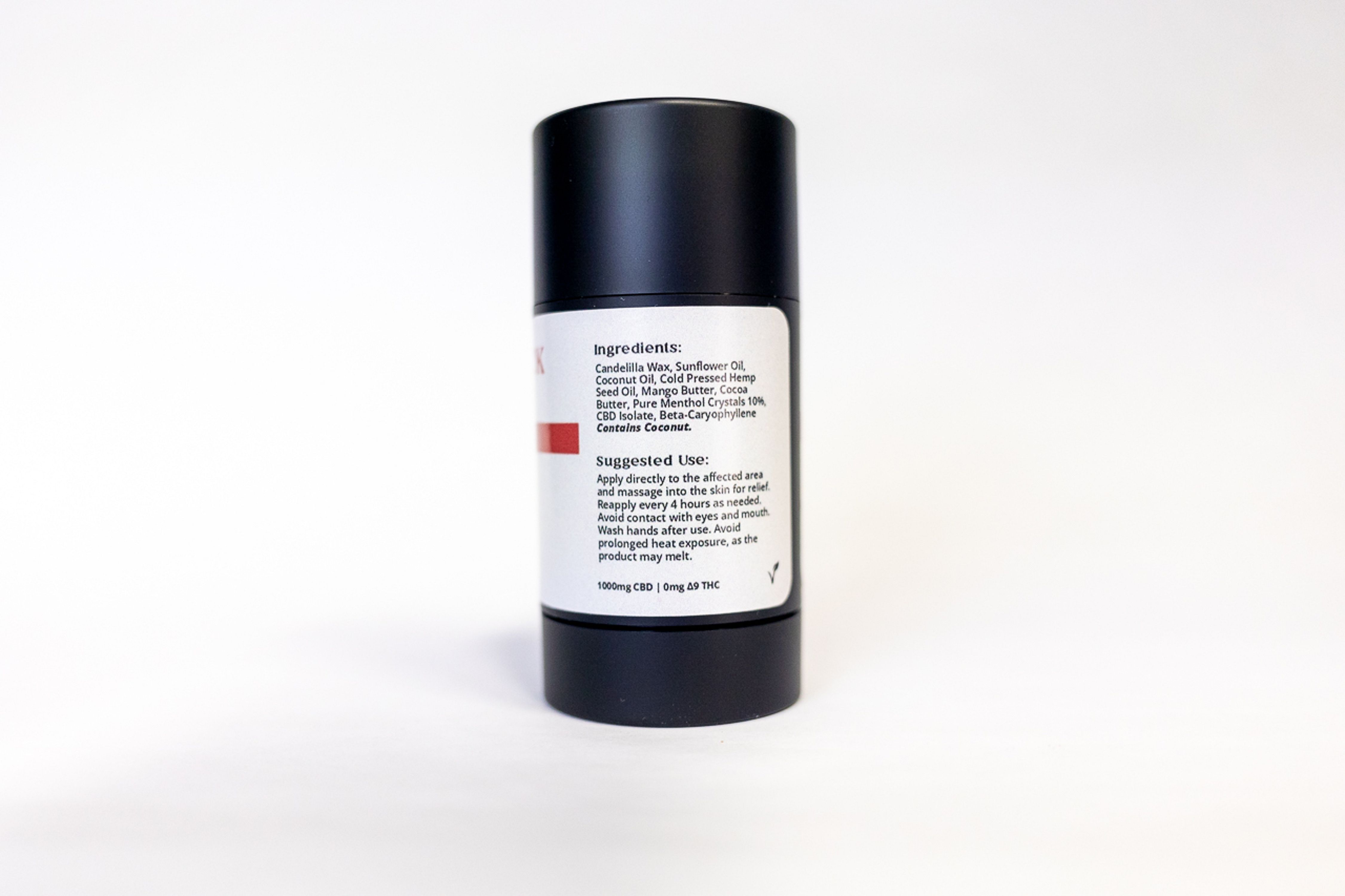 Ingredients: Candelilla Wax, Sunflower Oil, Coconut Oil, Cold Pressed Hemp Seed Oil, Mango Butter, Cocoa Butter, Pure Menthol Crystals 10%, CBD Isolate, Beta Caryophyllene