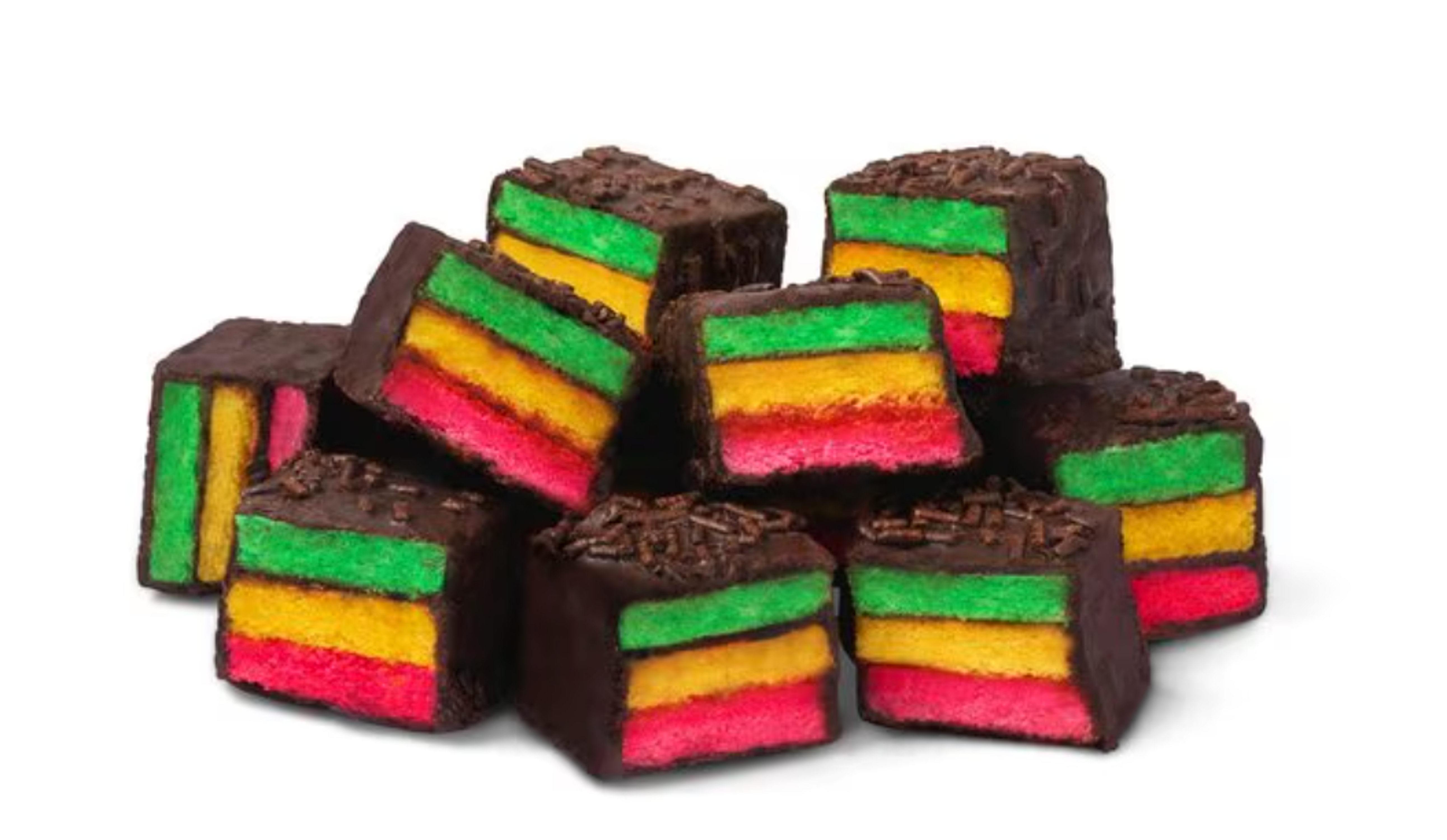 A selection of colorful cookies, each layer typically includes almond paste and is separated by raspberry jam, coated in chocolate. #Italiansummer