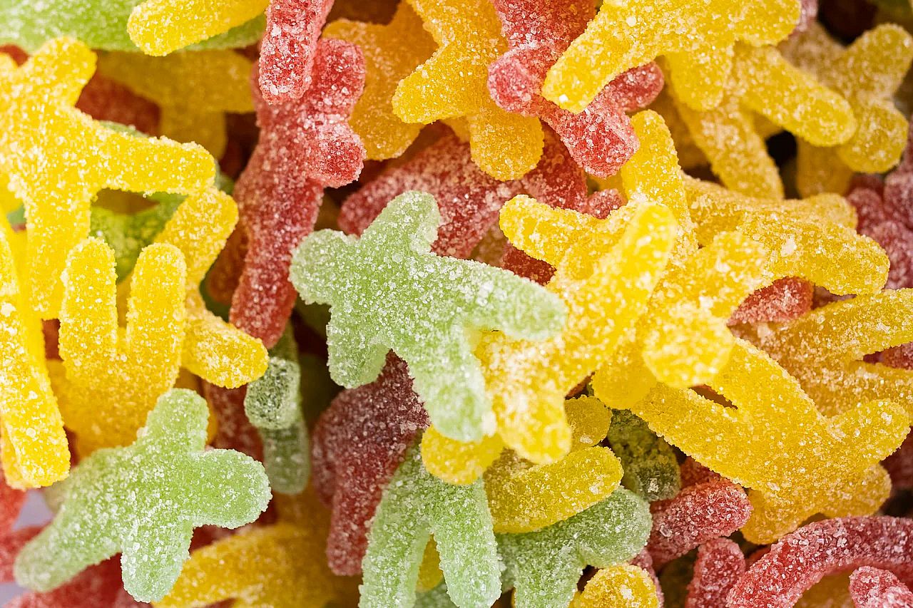 Sugar-coated fruit flavored jellies coated in sugar.