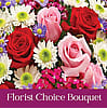 Florist designed pink purple and lavender mixed flowers in a wrapped bouquet