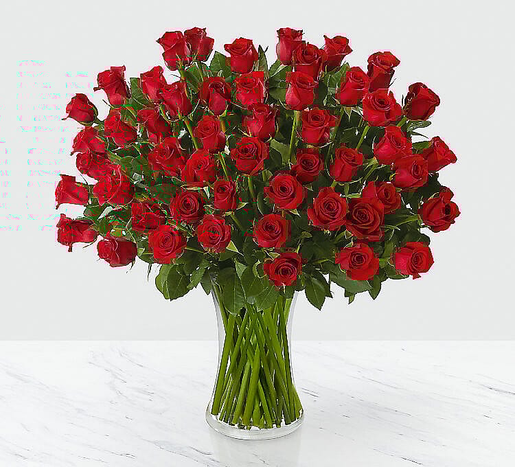 When you want a "wow" moment, this stunning bouquet of 50 long-stem red roses is for you. This arrangement includes baby's breath and greens in a glass vase.