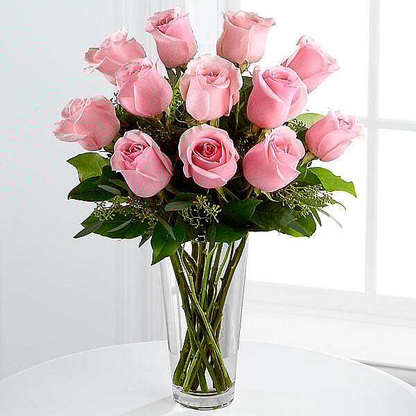 Soft pink or red roses are the perfect bouquet for all the loves in your life for any occasion. This arrangement includes baby's breath and greens in a glass vase. Specify color in notes