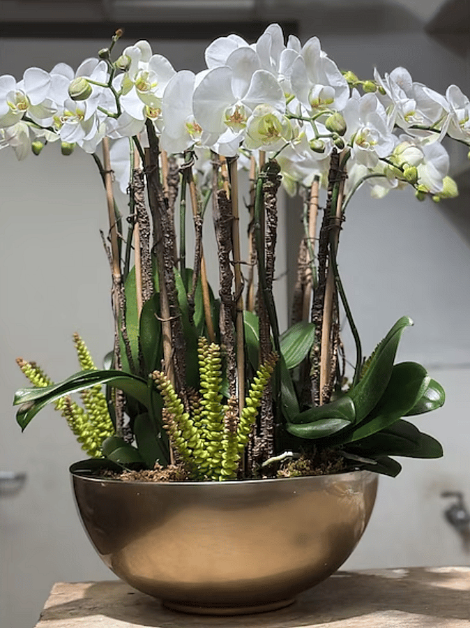 This orchid display includes 5 double white orchid plants! Succulents and all the goodies to make this piece look extra special. Gold or white container.
