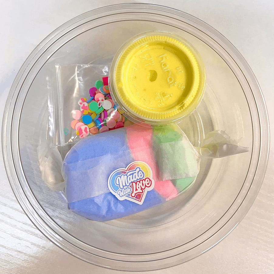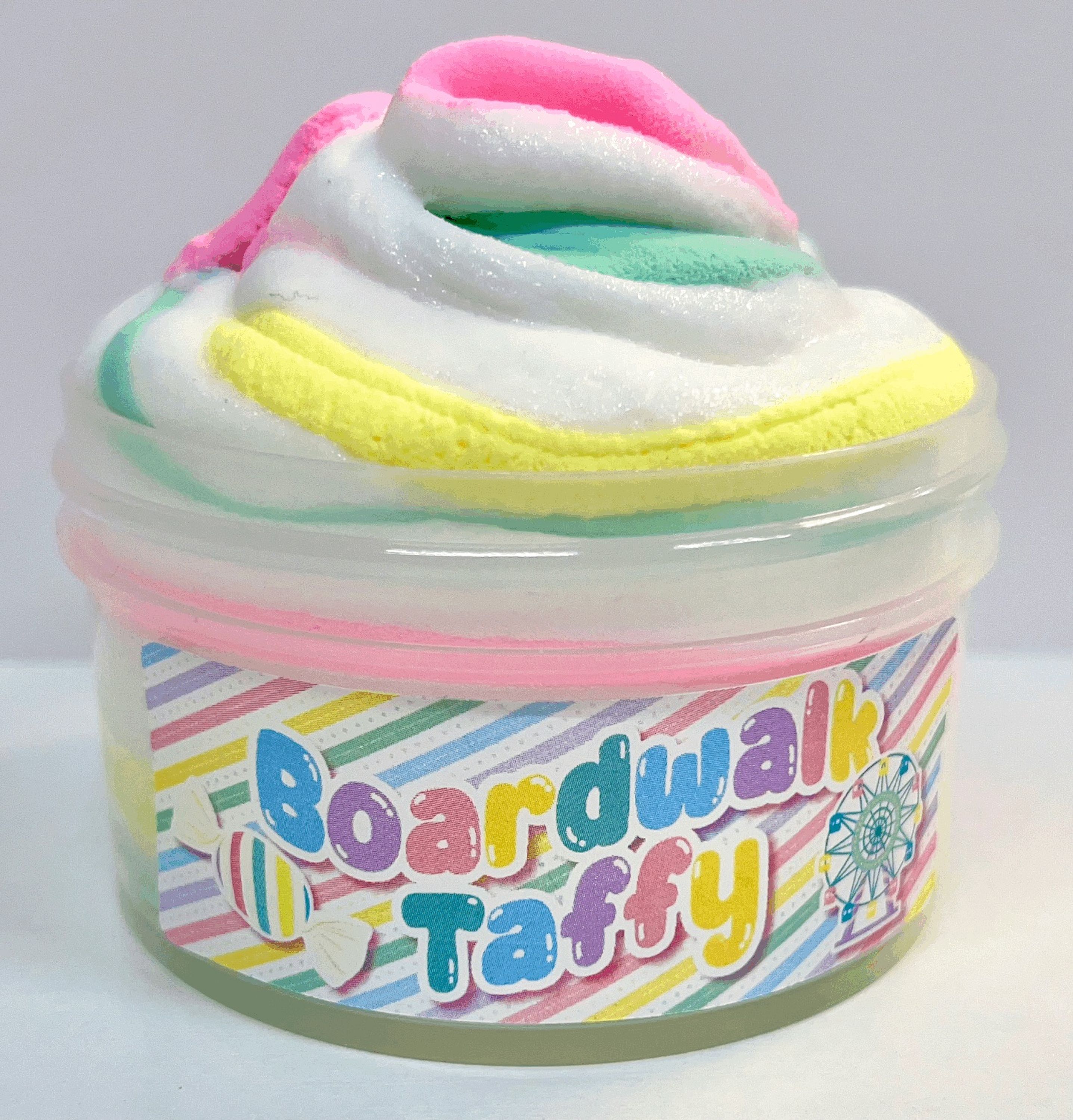 Introducing Boardwalk Taffy, a soft and stretchy slime that captures the delightful scent of sugary sweet taffy. It features a beautiful swirl of pastel shades, blending pinks, teals and yellows for a dreamy, candy-inspired look. To make it even sweeter, this slime comes with a realistic clay piece of taffy wrapped in wax paper, adding a fun, tactile element to your play. Topped with colorful sprinkles and a pastel yellow drizzle, Sweet Taffy is a truly irresistible treat for both the eyes and the senses!
