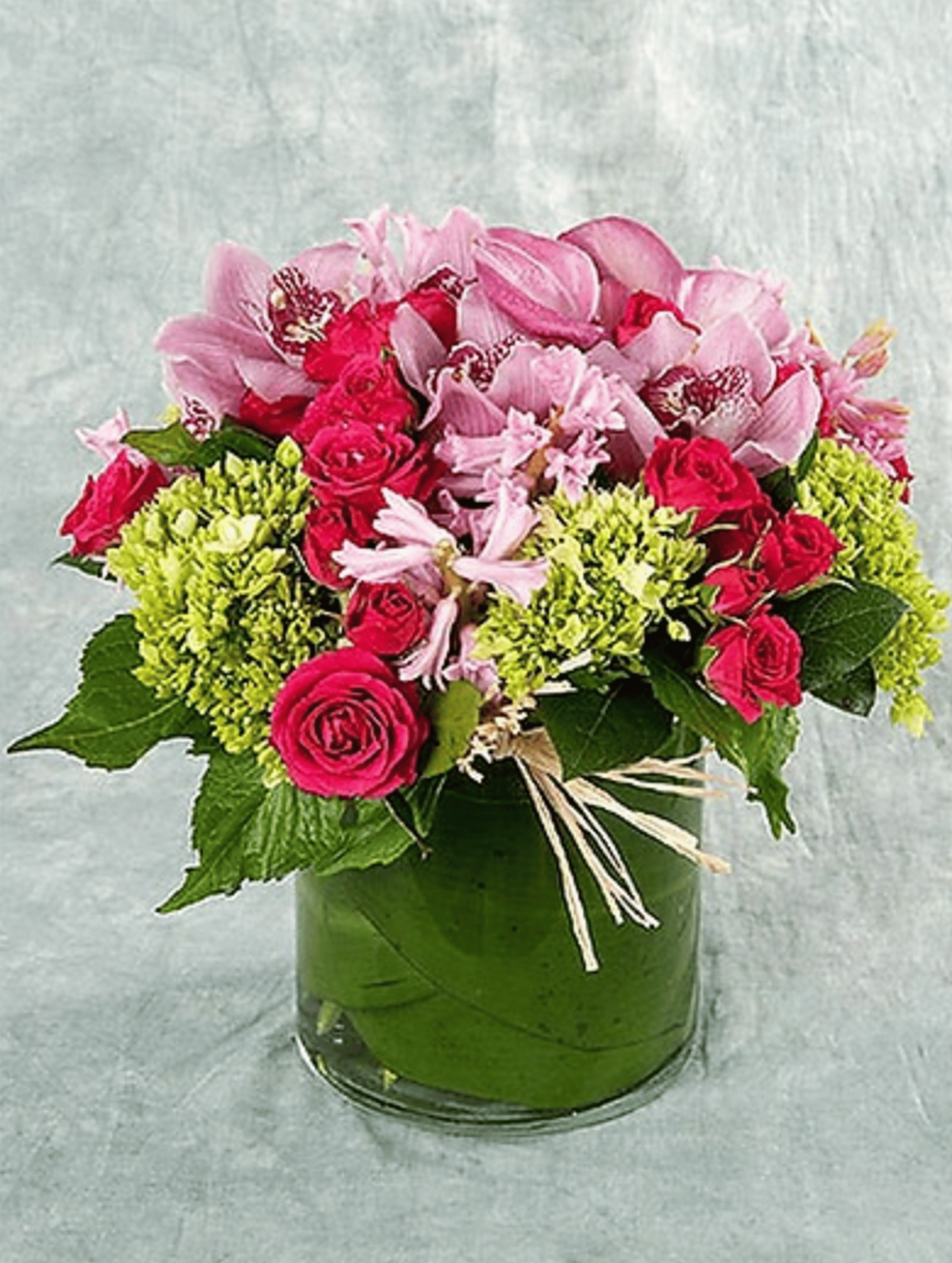 Lush mix in shades of pink with touch of fuchsia and green. Flowers and vase subject to change due to availability and seasonality.