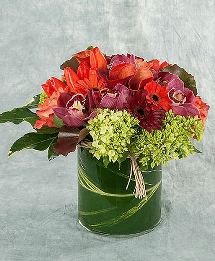 Lush mix in rich vibrant colors. Flowers and vase subject to change due to availability and seasonality.