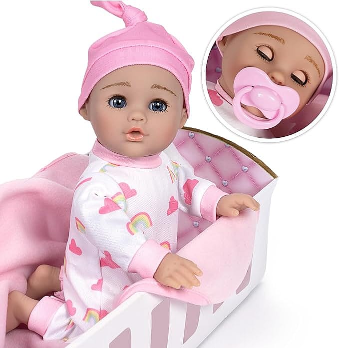 7-PIECE DOLL SET - This Adora Rainbow Hugs baby doll set includes one 13" realistic baby doll with open/close eyes, a rainbow-print onesie, a pink knot beanie, a pink pacifier, a doll diaper, a magical disappearing milk bottle, a pink doll blanket.