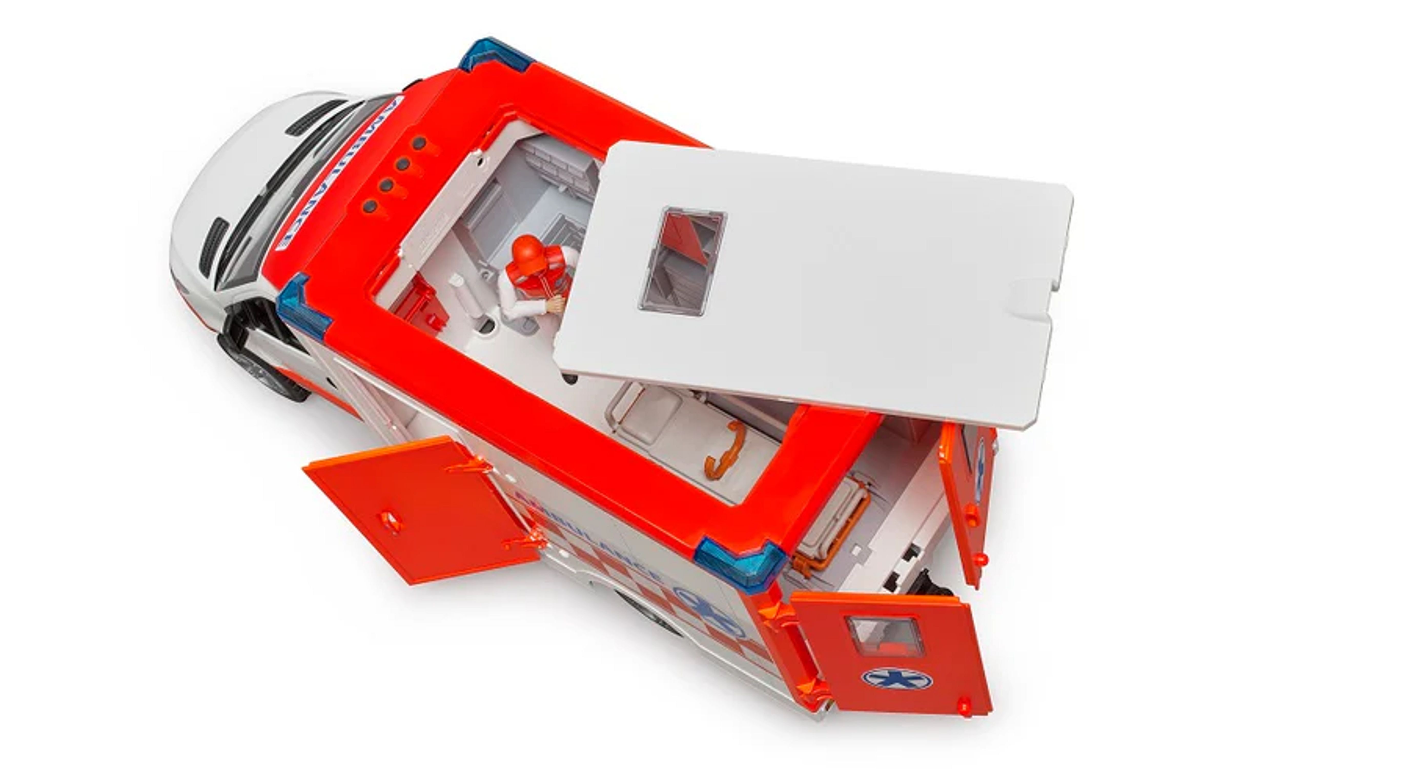 The topic of emergency vehicles plays an important role for the Bruder company. The MB Sprinter ambulance has now been added to round off this range. If an operation is to be re-enacted, this vehicle, equipped with a variety of functions, is a must. The paramedic included in the delivery climbs into the driver's cab through the opening doors. With the integrated light & sound module with various siren signals and lighting functions, the ambulance gets to the scene of the operation quickly and safely. The little paramedic has access to the state-of-the-art treatment area through the opening rear doors and side doors, as well as the removable roof module. On the height-adjustable stretcher, which can be pulled out and pushed back in again, every bworld figure can find space for treatment and can be transported safely, in keeping with the Bruder motto - just like the real thing. The play value of this great vehicle can be expanded with the accessory set 62710, consisting of a paramedic and patient, and the bworld infirmary