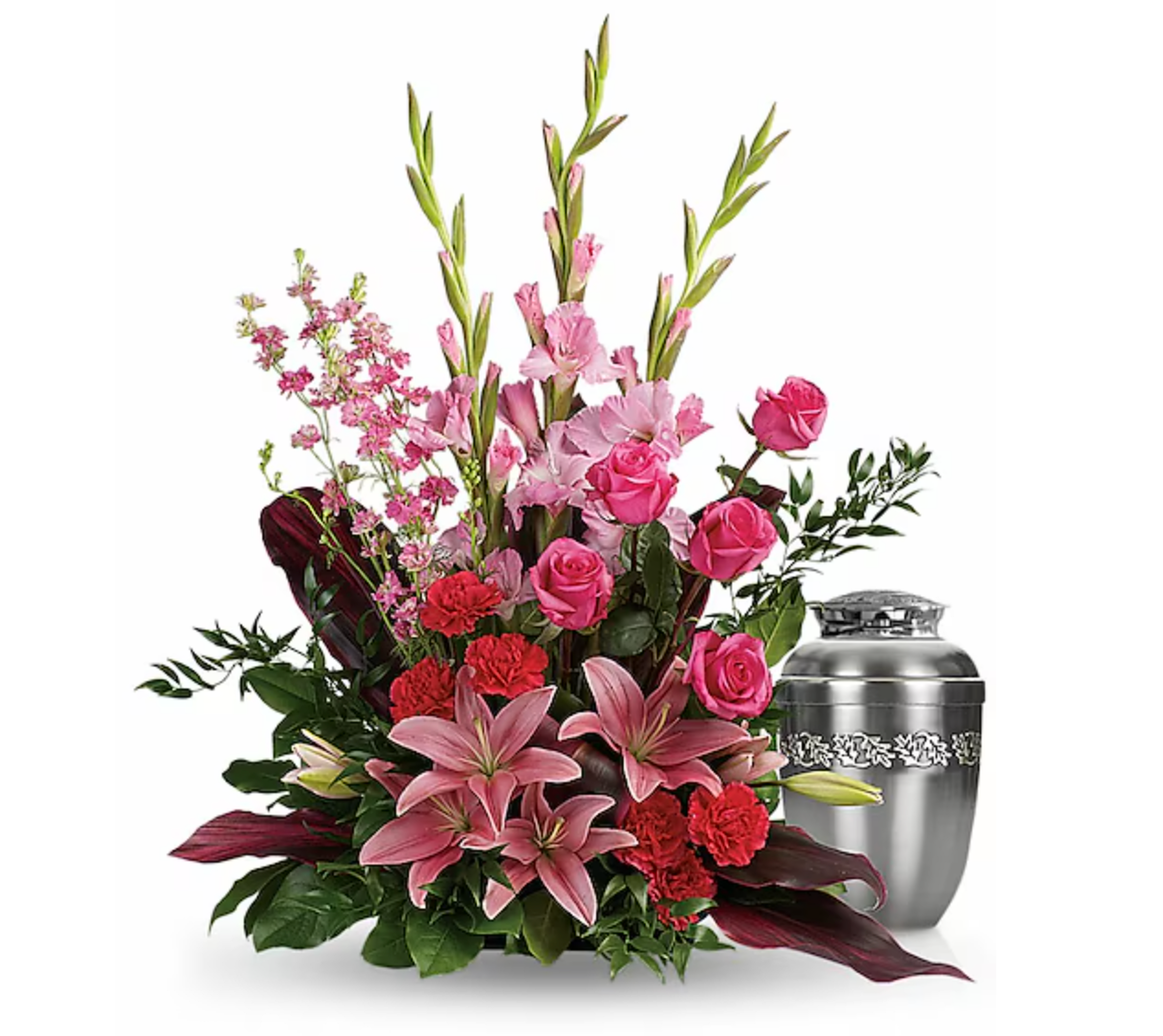 Share your heartfelt feelings on the loss of someone special with this feminine arrangement of pink roses, lilies and gladioli. It's a rich reminder of your love at the memorial service.