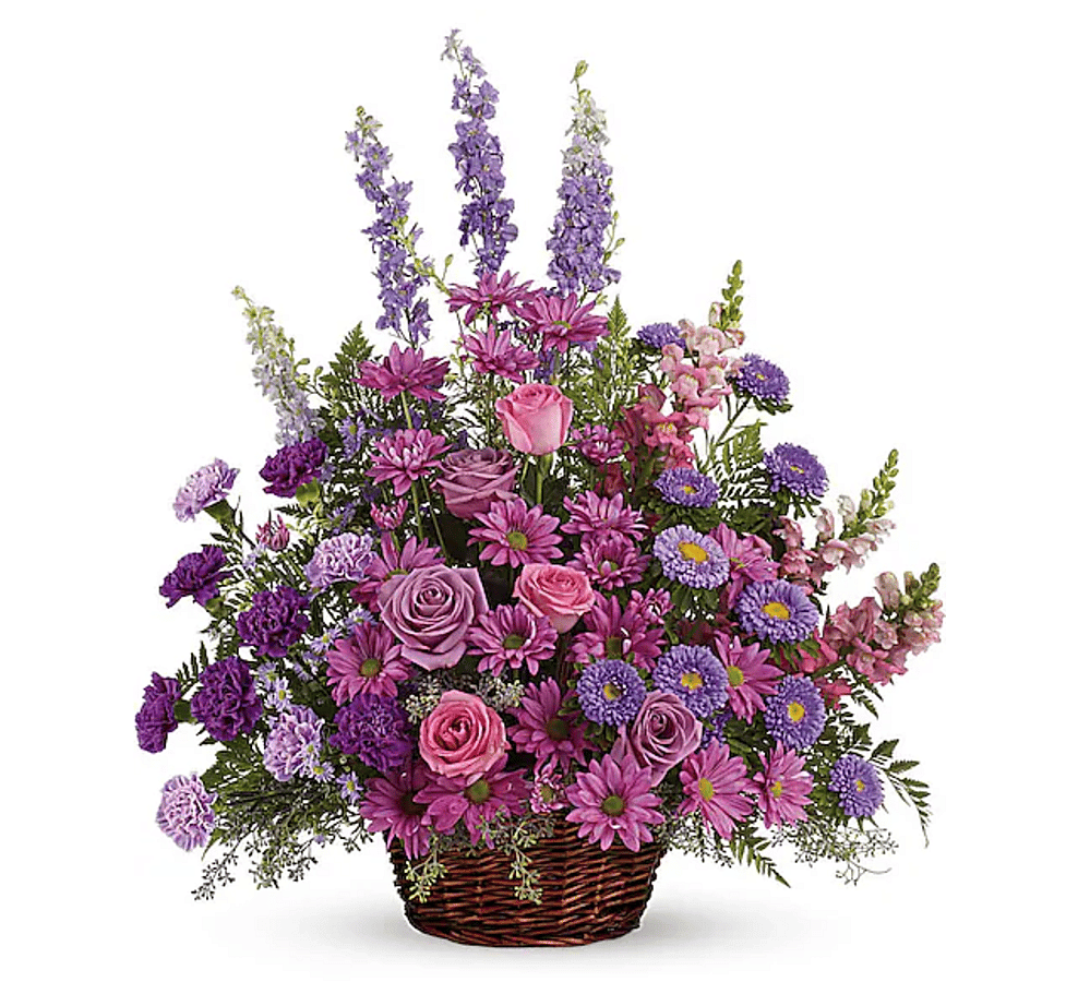 A profusion of purple, pink and lavender blooms such as roses, carnations, larkspur, matsumoto and monte cassino asters and much more are delivered in a round wicker basket.
