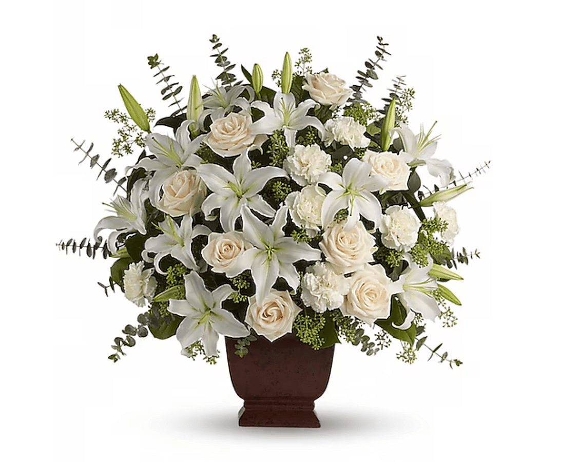 Fresh flowers such as crème roses, white oriental lilies, carnations, eucalyptus and more are delivered in a lovely Noble Heritage urn.