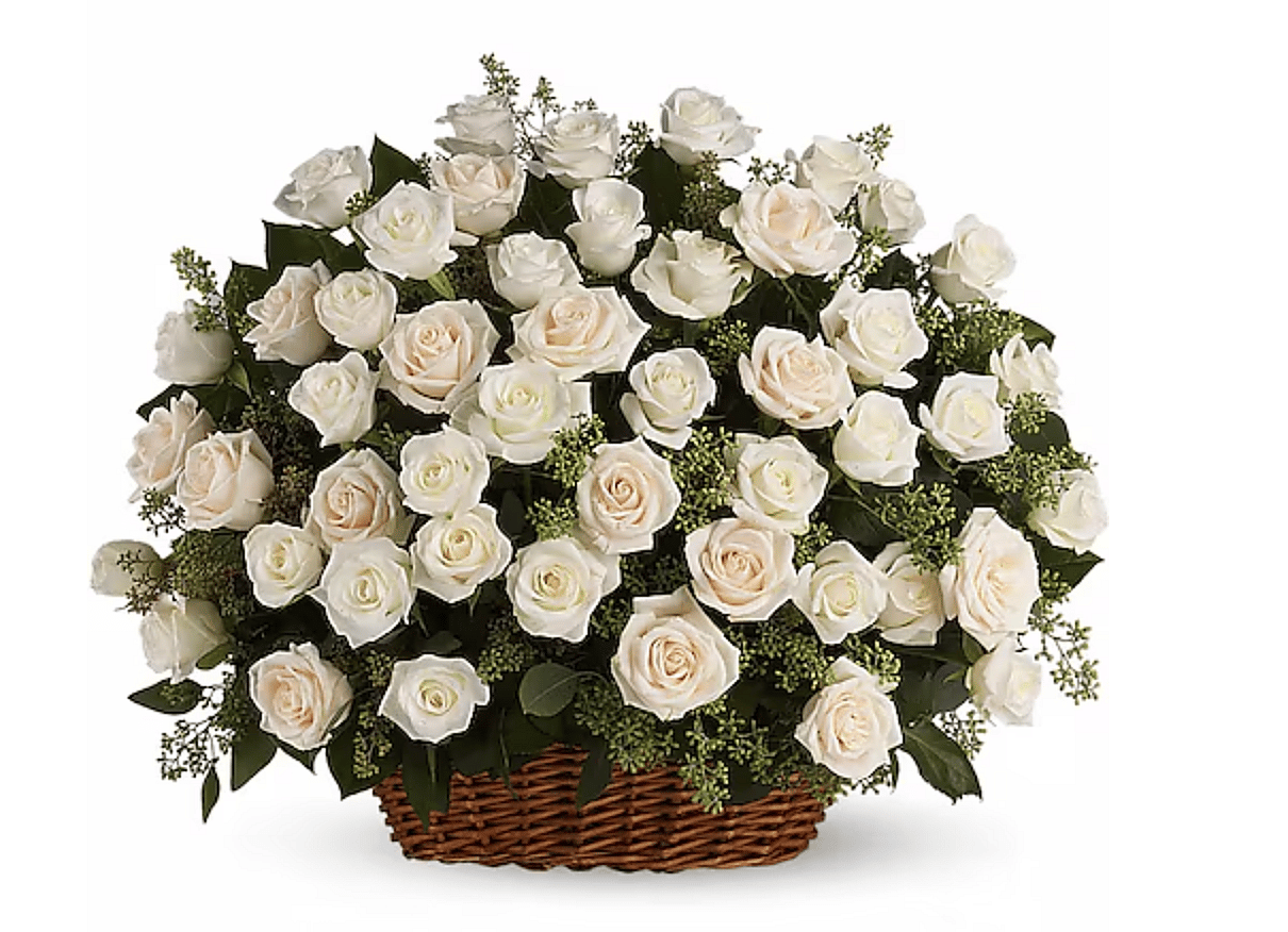 A beautiful, bountiful basket of luminous white roses that feels so fresh, natural, and welcomed in a home or at a service. White and crème roses with fragrant seeded eucalyptus beautifully presented in a large basket.