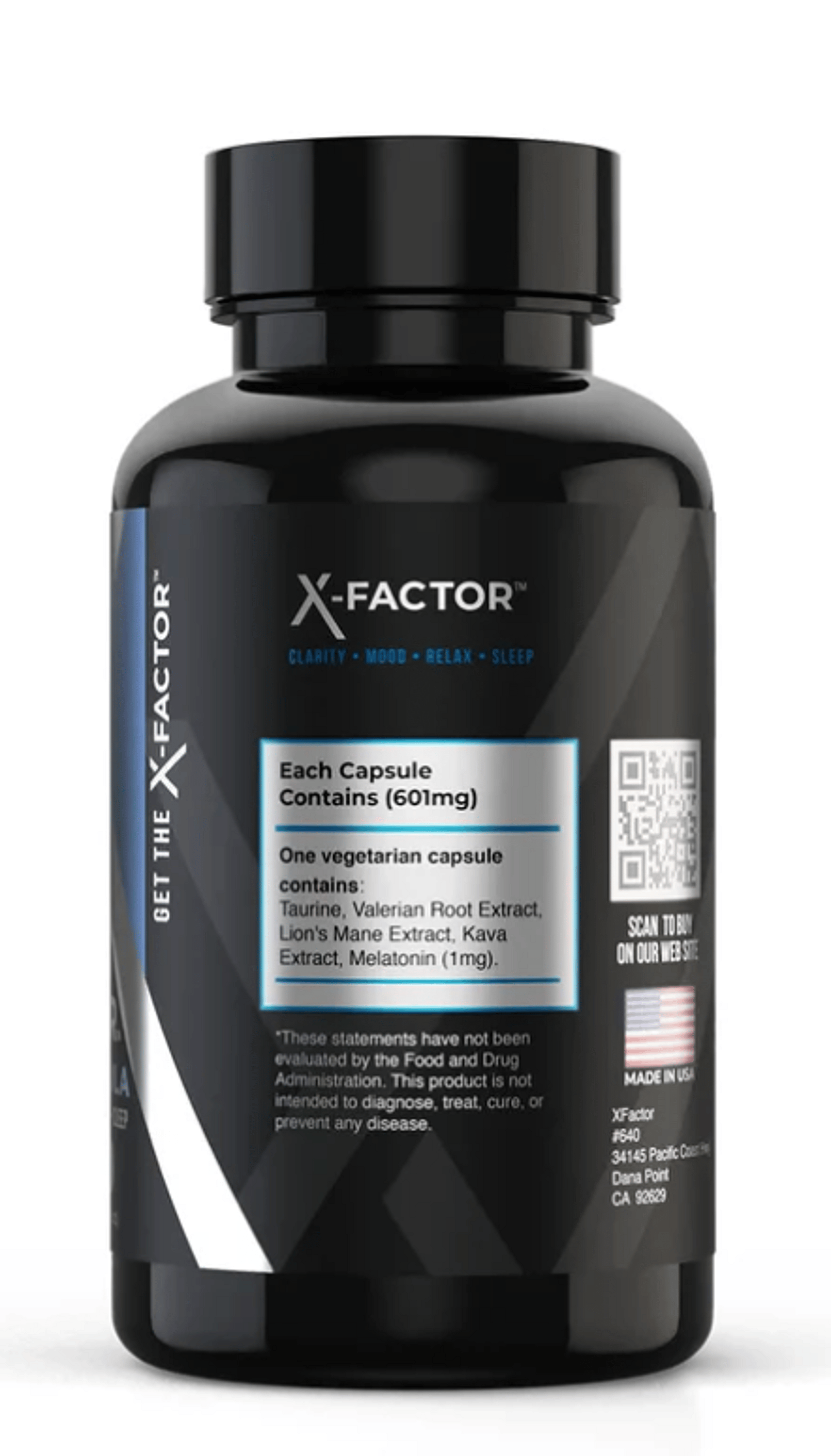 Each Capsule Contains (601mg): Taurine, Valerian Root Extract, Lion's Mane Extract, Kava Extract, Melatonin (1mg).