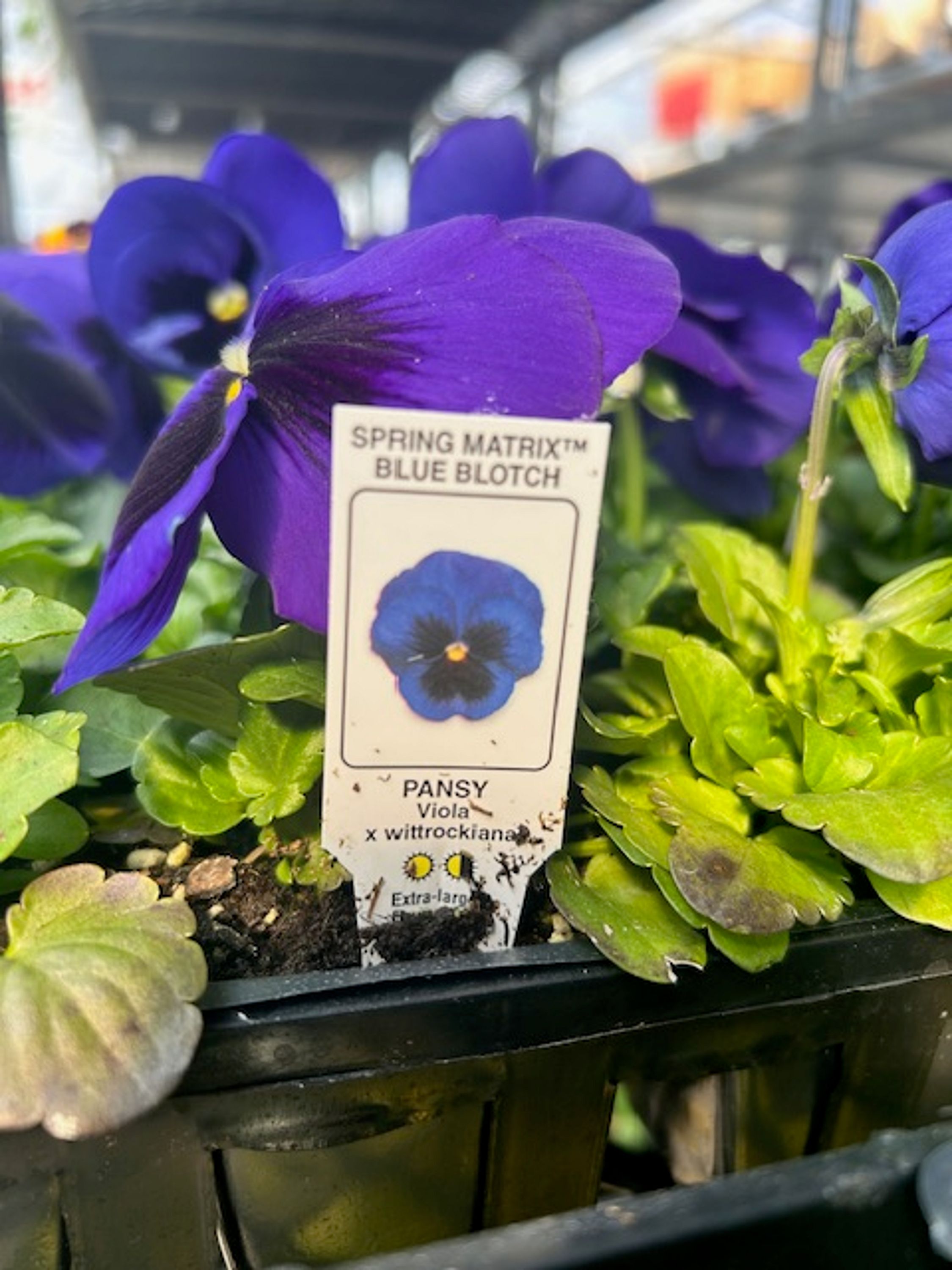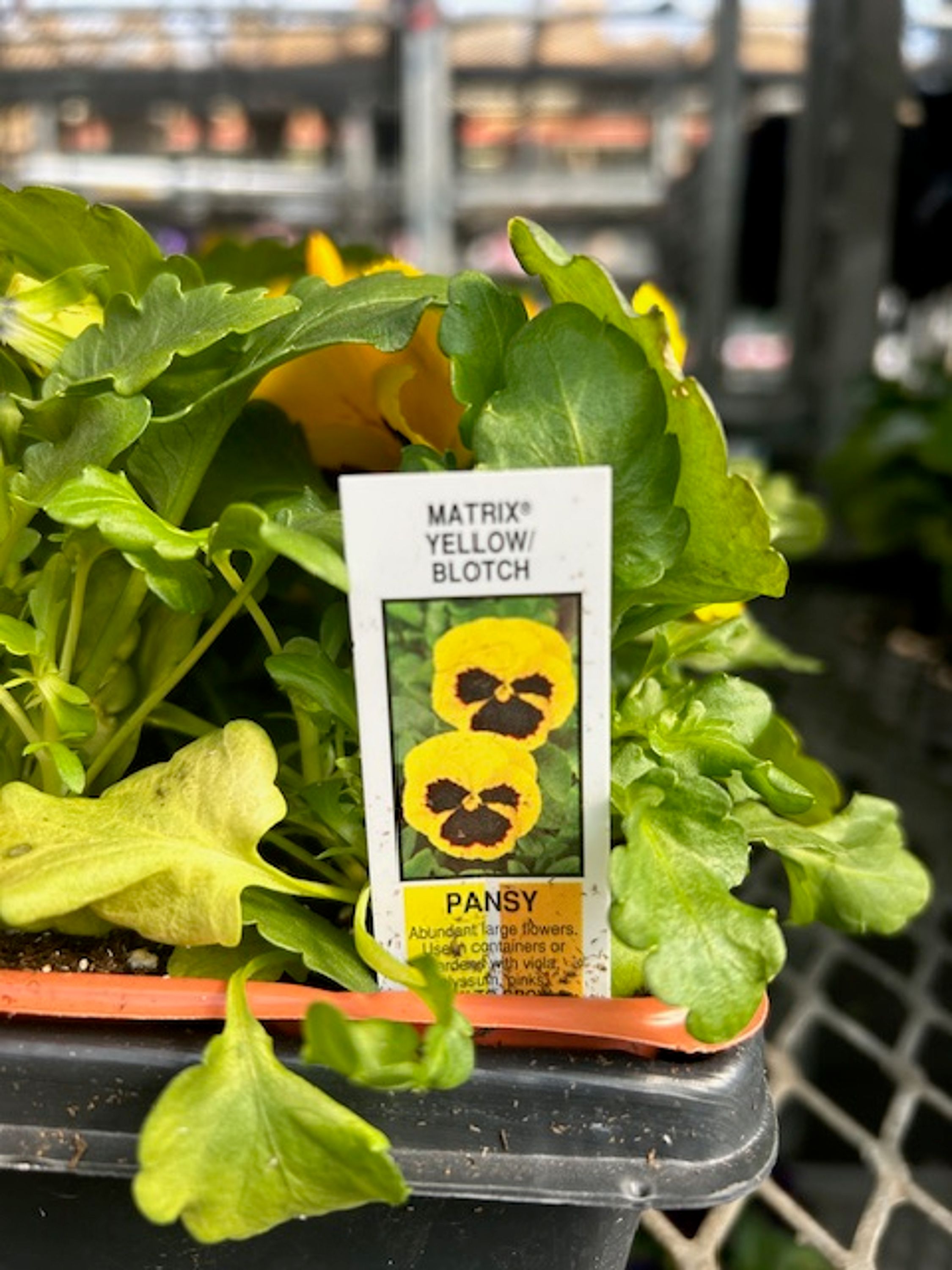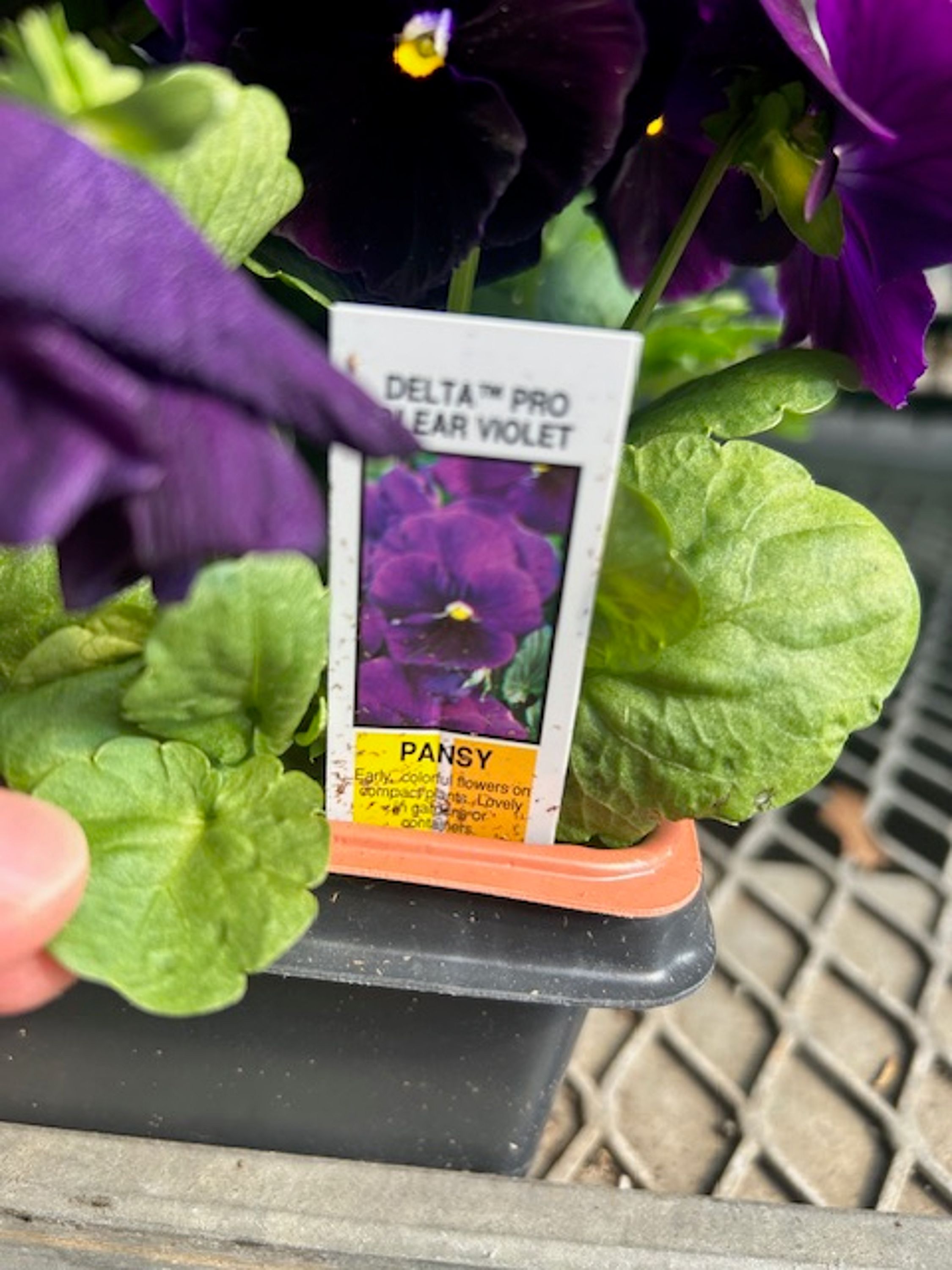 The pansy is a group of large-flowered hybrid plants cultivated as garden flowers. The pansy flower is two to three inches in diameter and has two slightly overlapping upper petals, two side petals, and a single bottom petal with a slight beard emanating from the flower's center. The plant may grow to nine inches in height, and prefers sun to varying degrees and well-draining soils. Product photos are for illustrative purposes only. Solid Colors subject to availability.