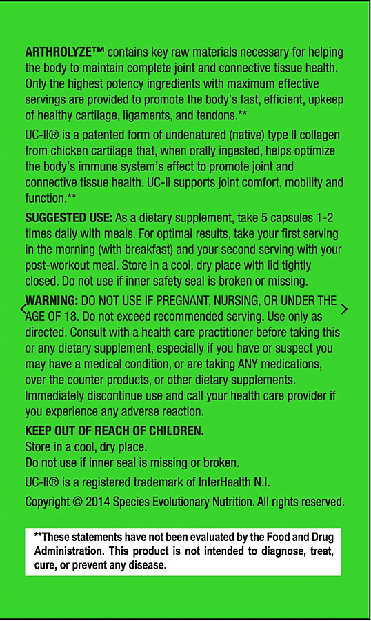 ARTHROLYZE ELITE™ contains key raw materials necessary for helping the body to maintain complete joint and connective tissue health. Only the highest potency ingredients with maximum effective servings are provided to promote the body's fast, efficient, upkeep of healthy cartilage, ligaments, and tendons.**