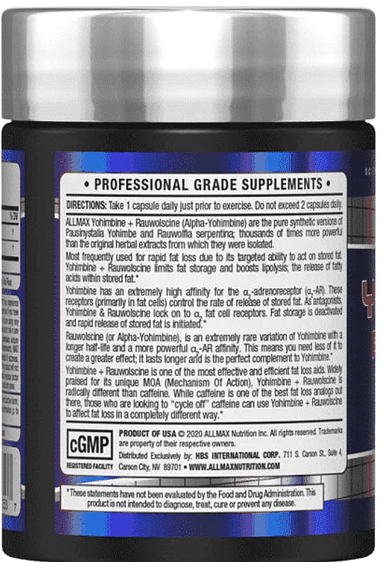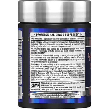 ALLMAX Yohimbine + Rauwolscine (Alpha-Yohimbine) are the pure synthetic versions of Pausinystalia Yohimbe and Rauwolfia serpentina; thousands of times more powerful than the original herbal extracts from which they were isolated. Most frequently used for rapid fat loss due to its targeted ability to act on stored fat. Very effectively shuts down fat storage and increases lipolysis; the release of fatty acids within stored fat.