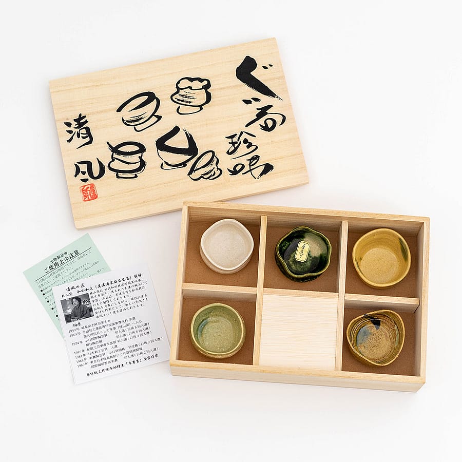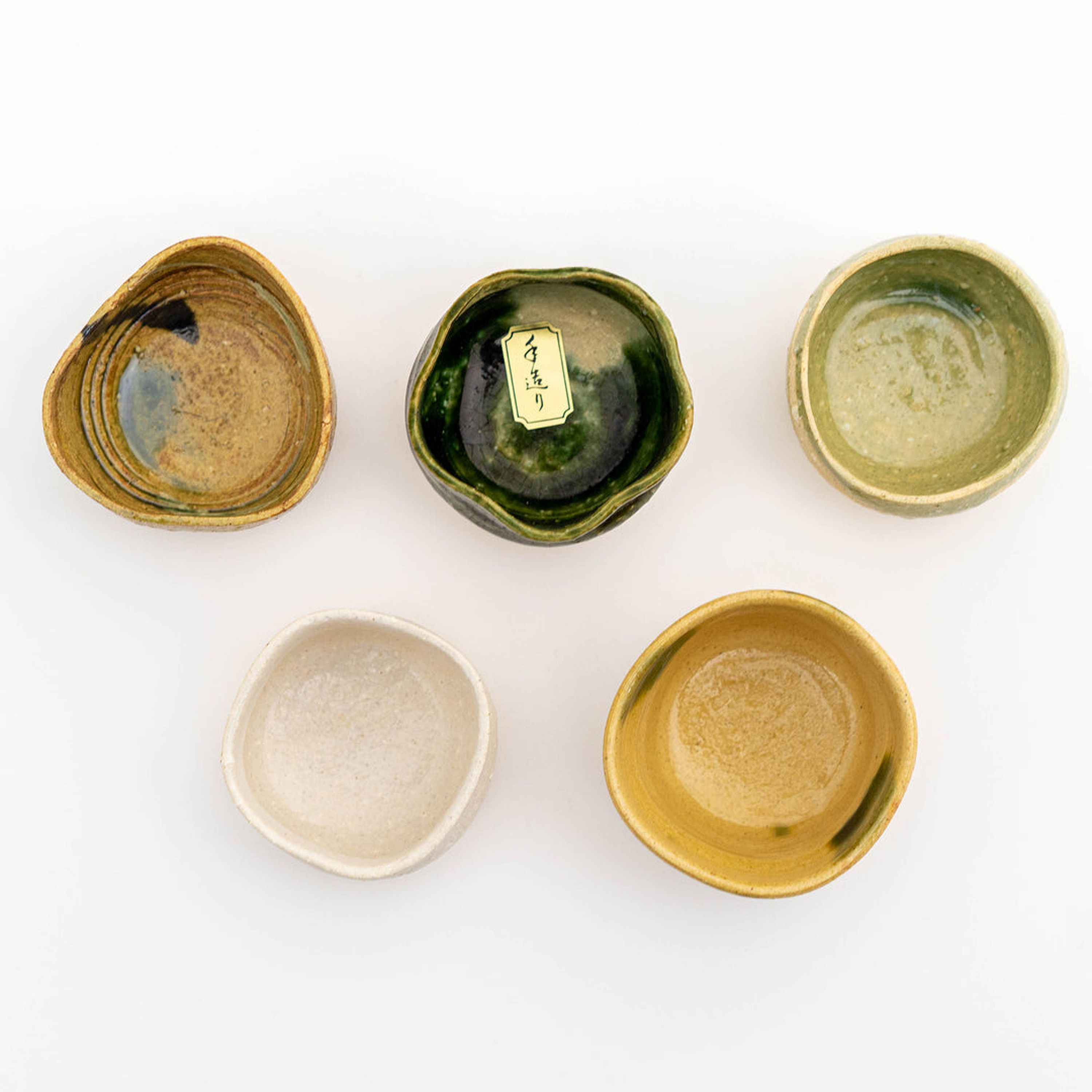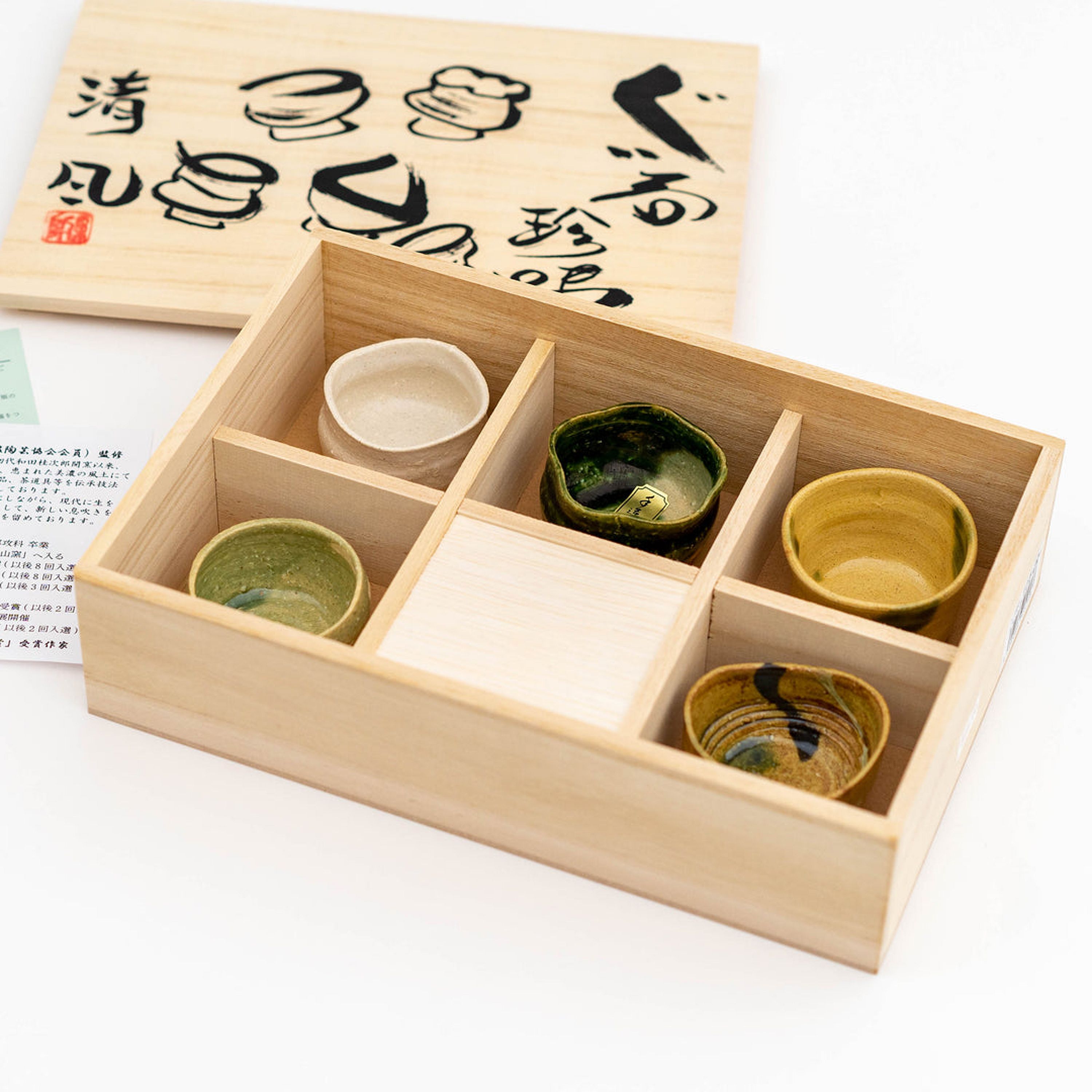 This exquisite sake cup set features five beautifully handcrafted cups, each with unique colors and textures. Made in Gifu, Japan, these cups offer a distinct hand feel, adding to their charm.