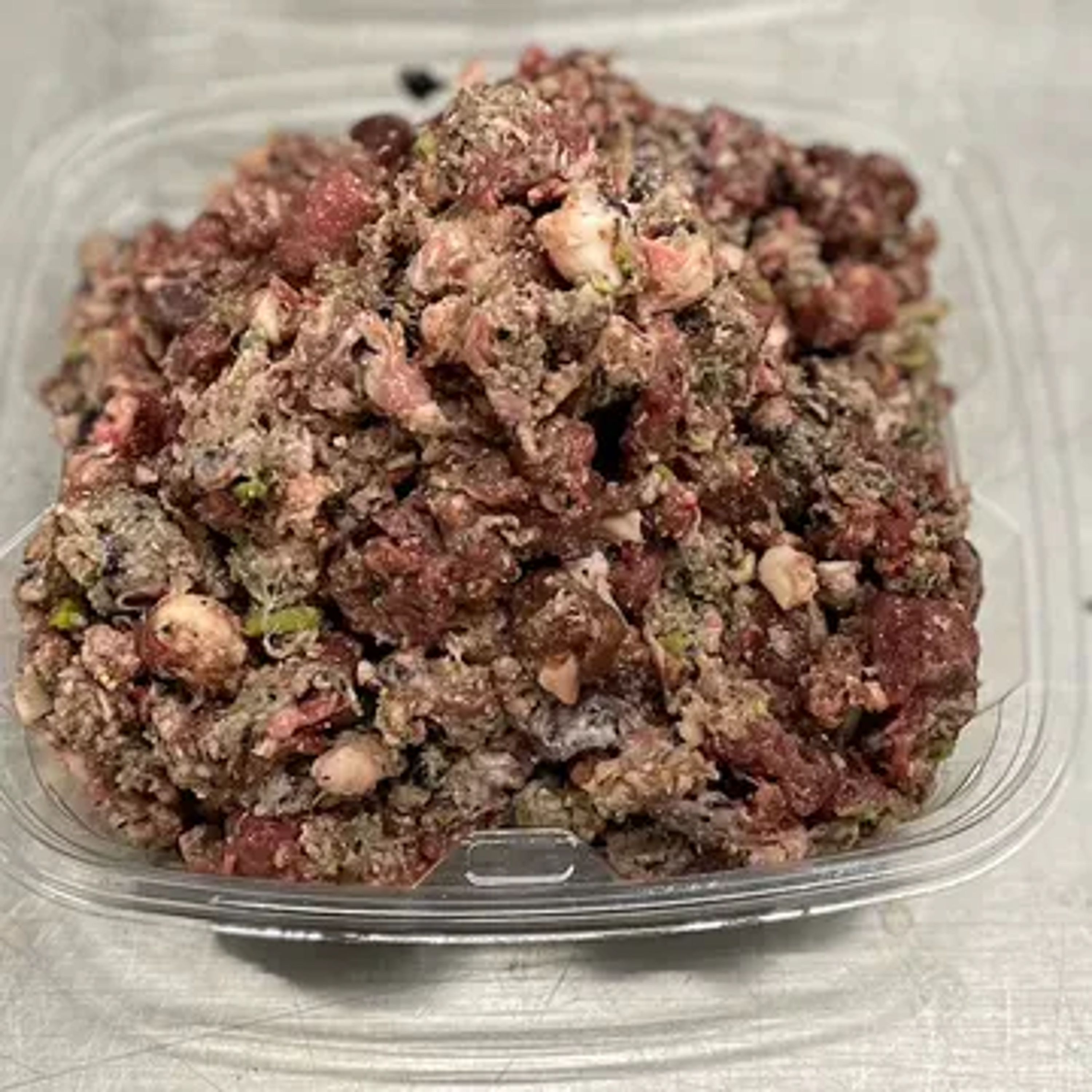 Beef Bone, Beef Organs, Beef Meat, Broccoli, Blueberries, Flax & Pumpkin seeds, Basil & Kelp.
