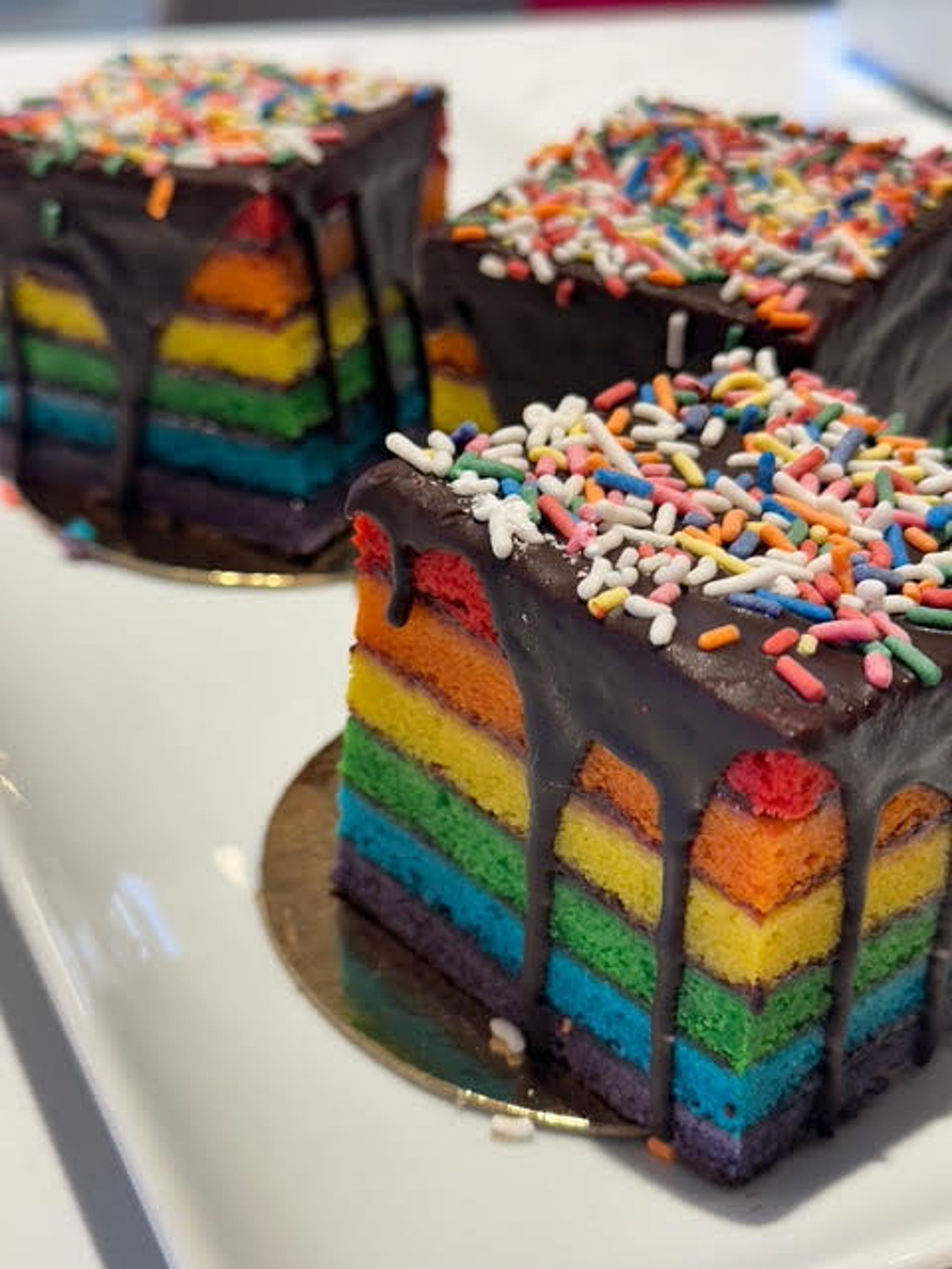 Rainbow colored 6 layer stack cube, almond cake layered with raspberry jam, glazed in chocolate, and topped with sprinkles.