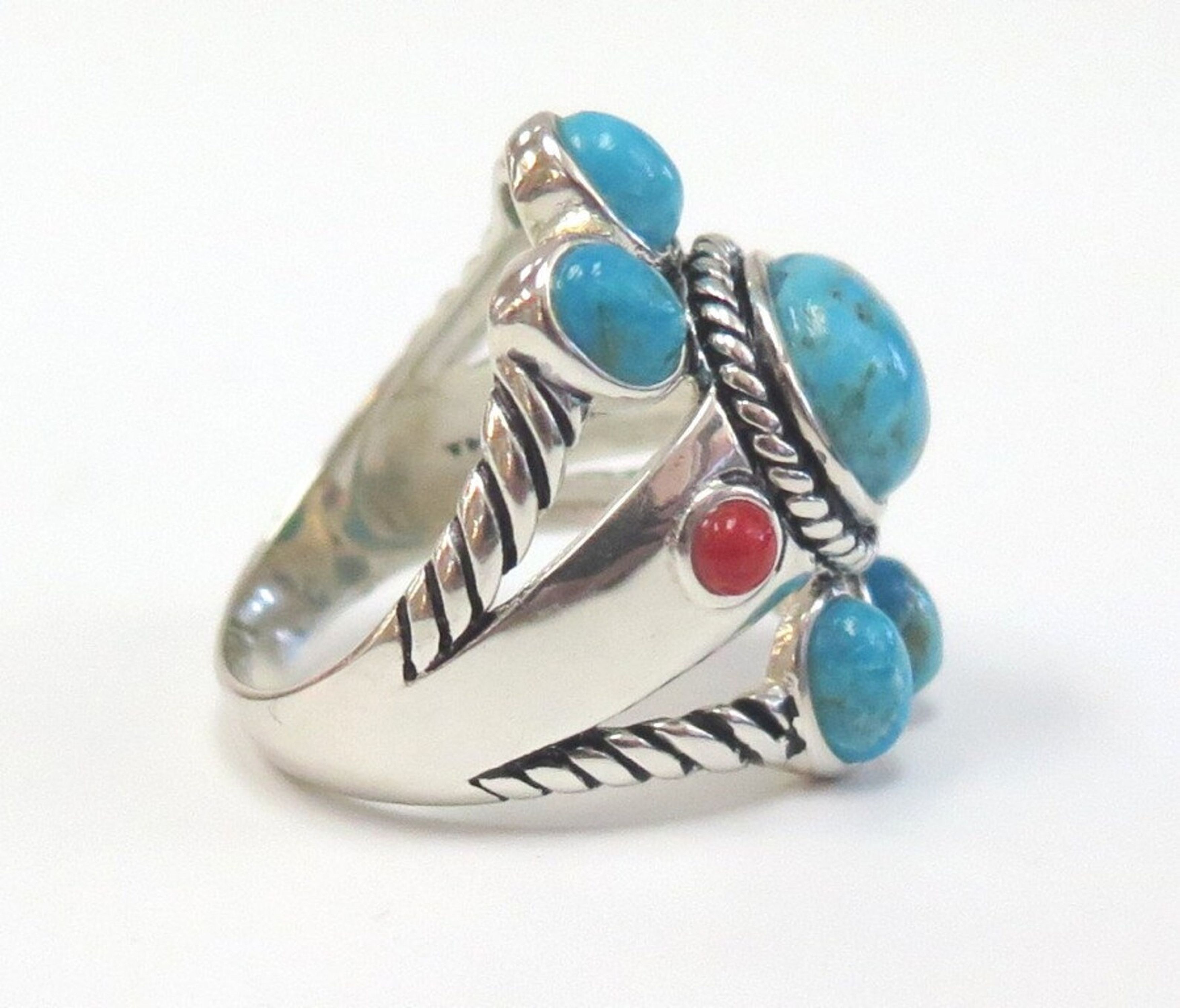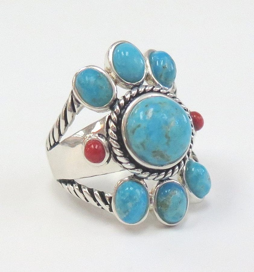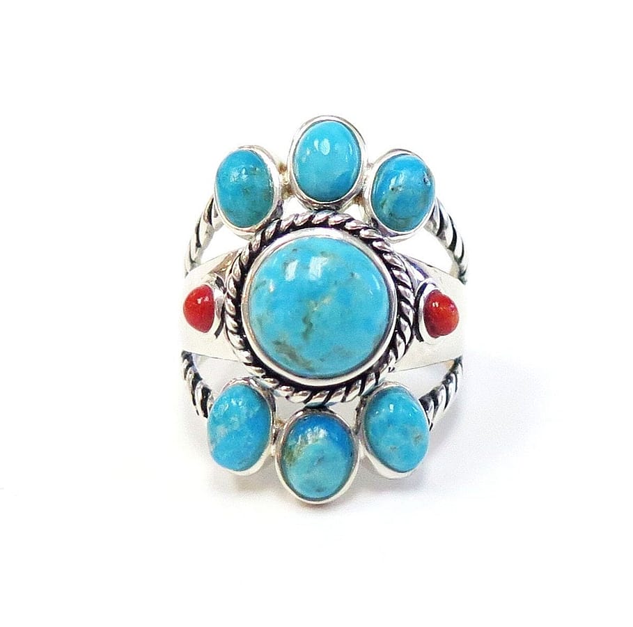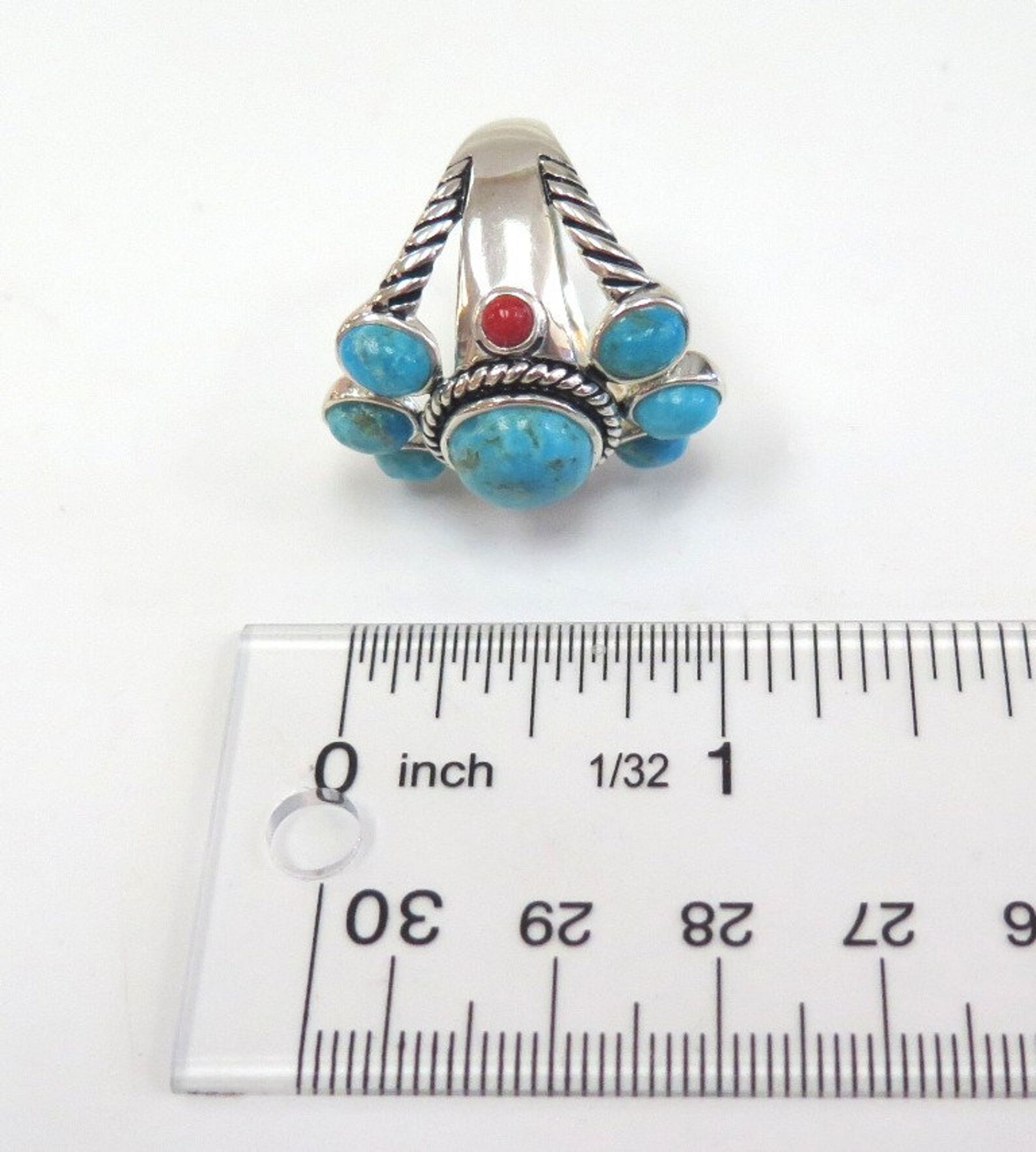 This stunning sterling silver ring has 6 oval shaped turquoise around 1 center round turquoise in a rope bezel. The rope design continues on the sides of the ring. On each side of the center stone there is a small red round coral accenting the center stone. The detailing is hand carved and the colors of the turquoise are a beautiful bright blue.