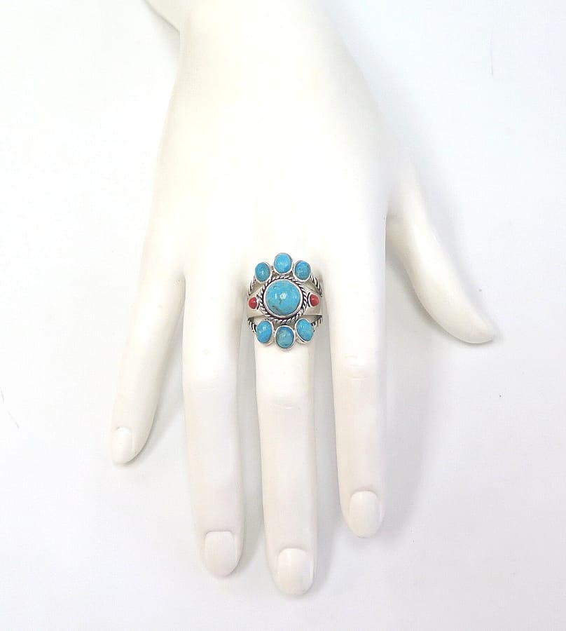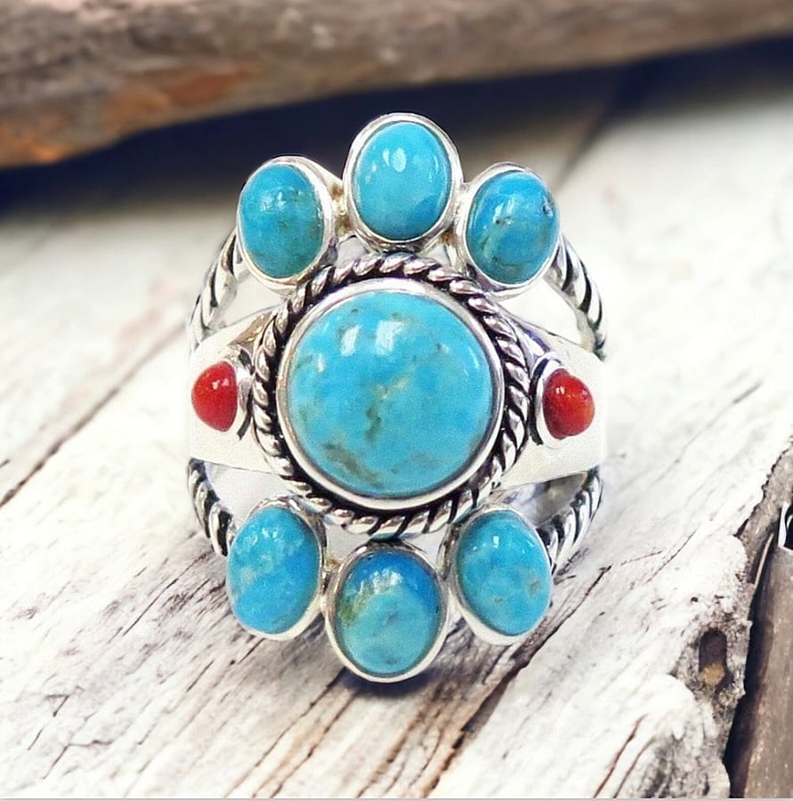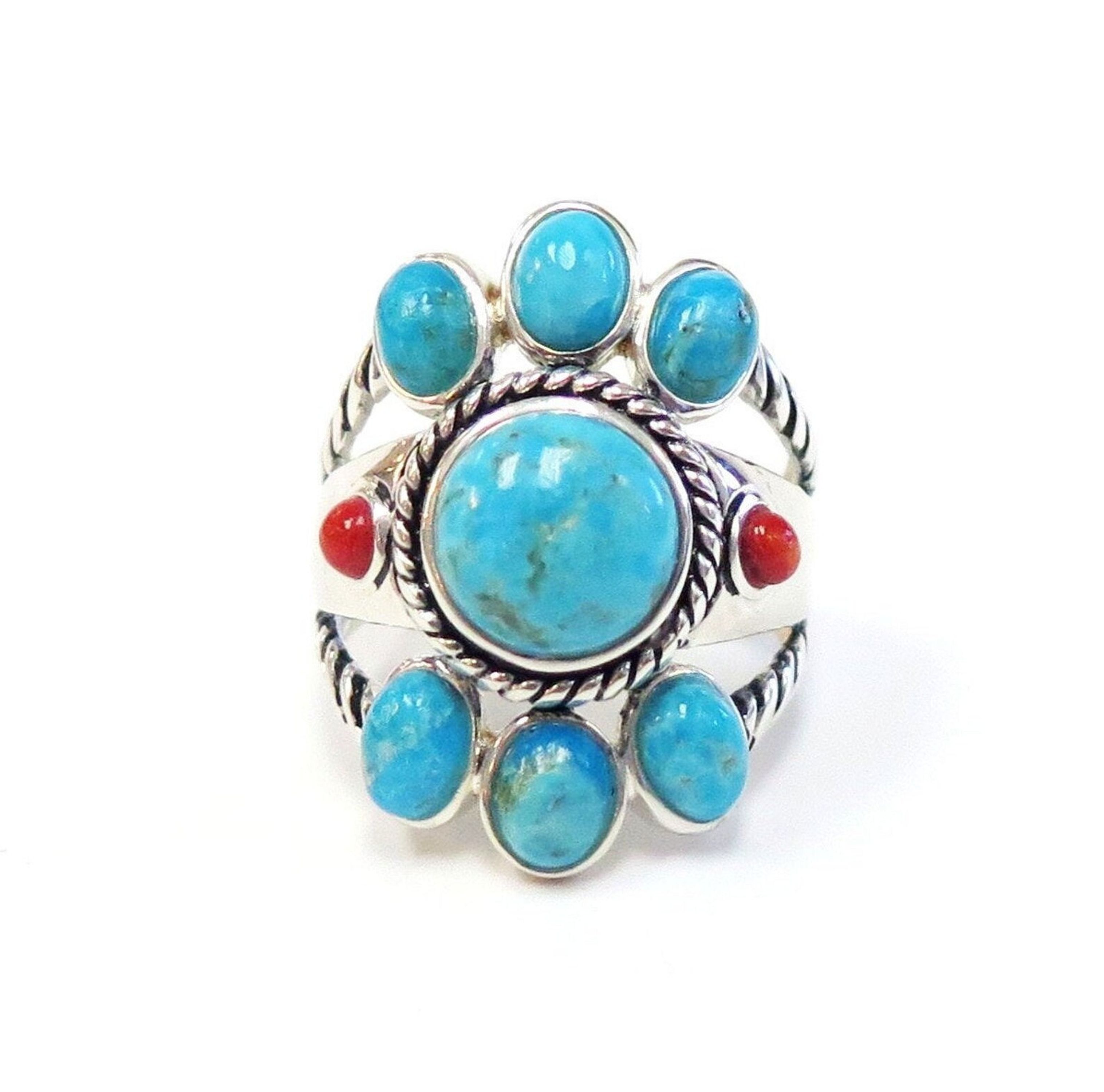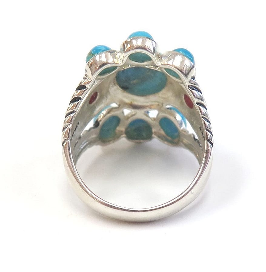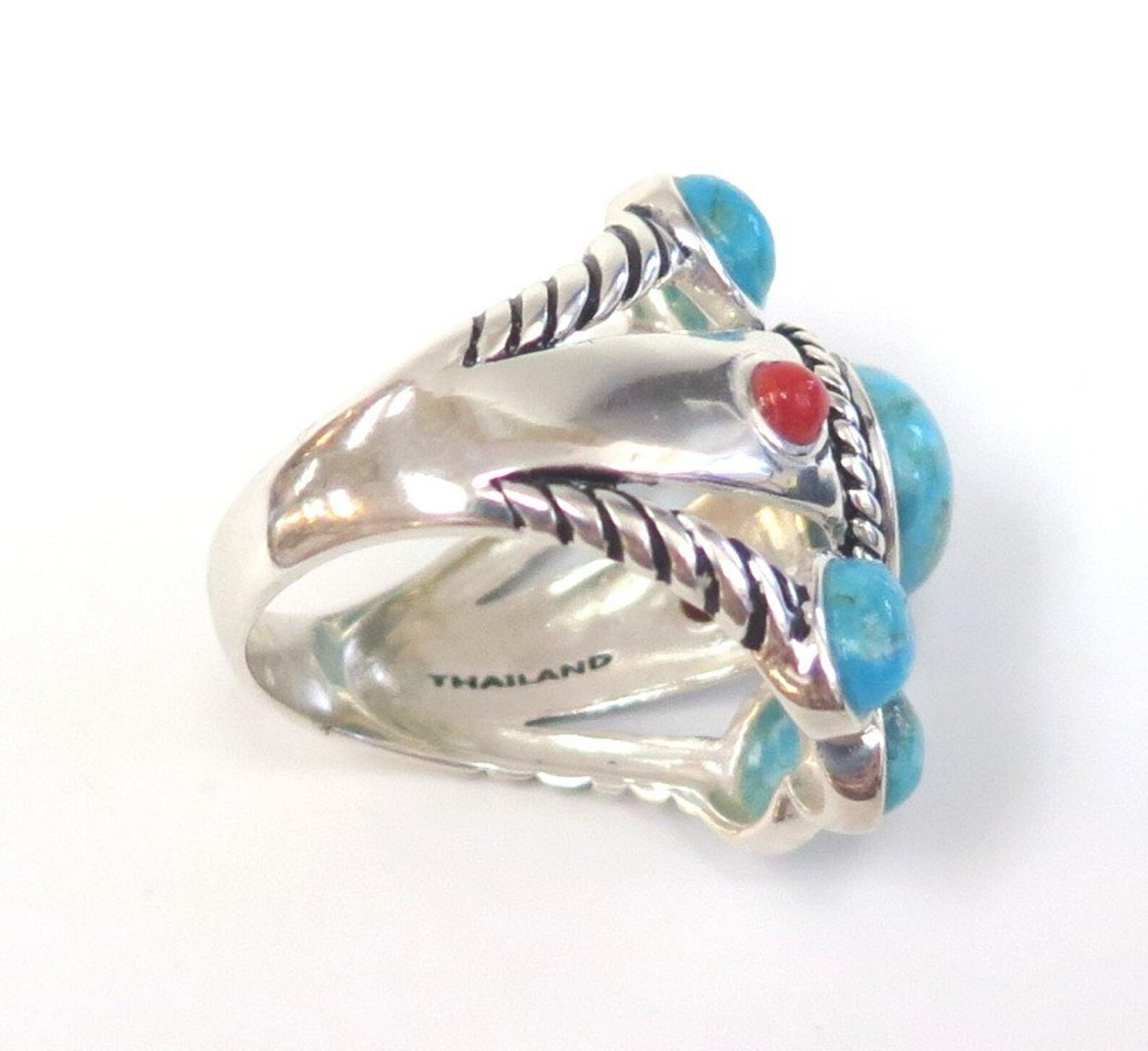 This stunning sterling silver ring has 6 oval shaped turquoise around 1 center round turquoise in a rope bezel. The rope design continues on the sides of the ring. On each side of the center stone there is a small red round coral accenting the center stone. The detailing is hand carved and the colors of the turquoise are a beautiful bright blue.