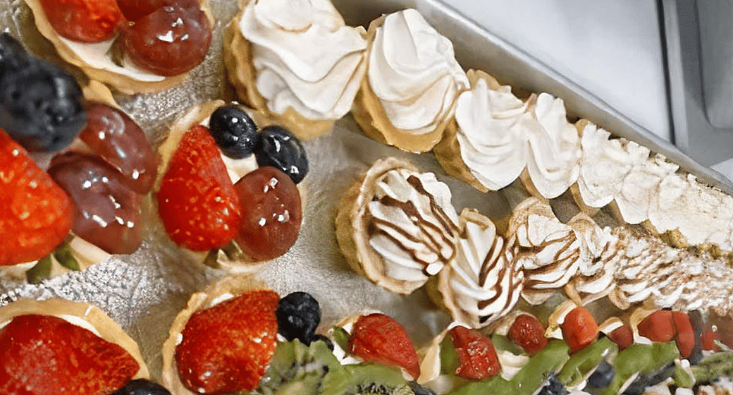 Mini fruit tart, mini lemon meringue, and mini dulce de leche.