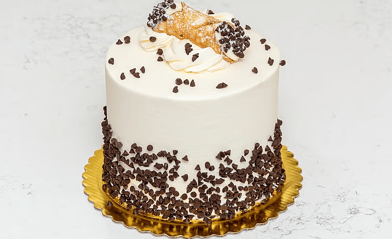 Cannoli cake is an almond cake made with fresh ricotta, mascarpone, orange zest, mini chocolate chips and whipped cream icing. #Italiansummer