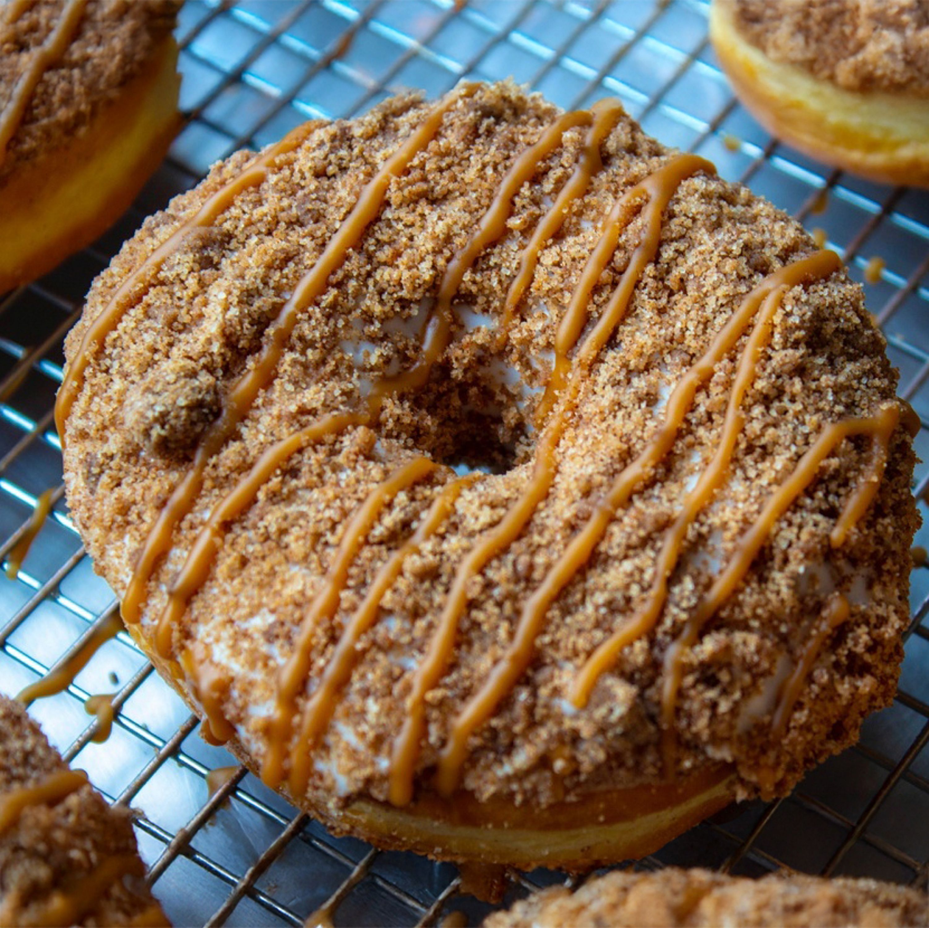Vanilla iced topped with housemate cinnamon streusel and a caramel drizzle
