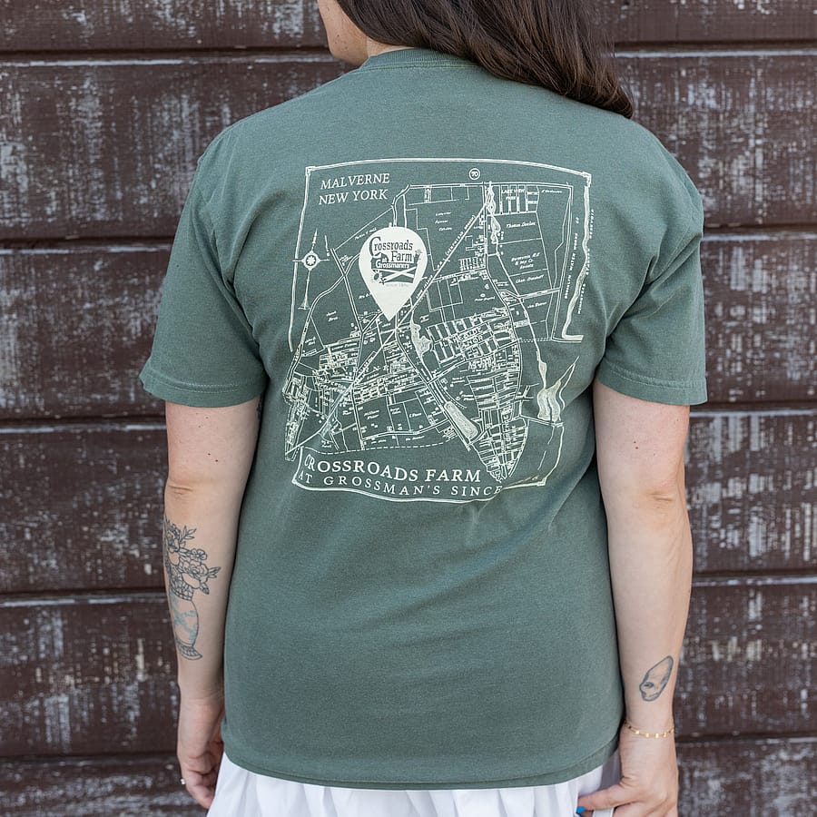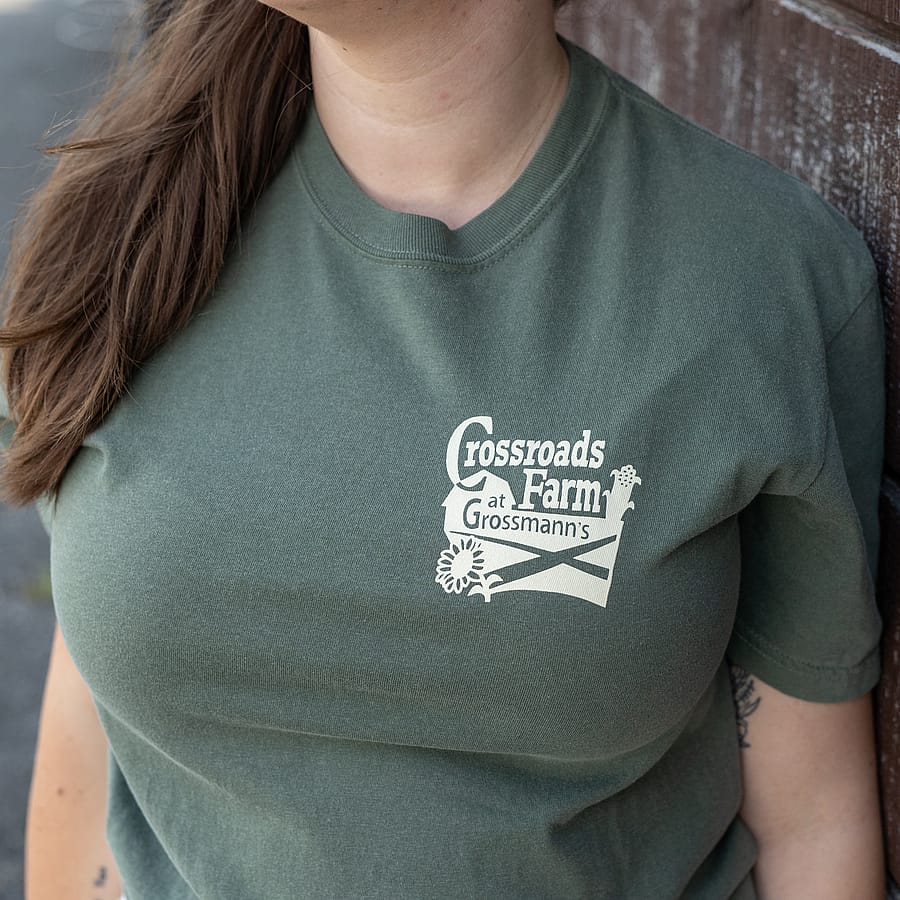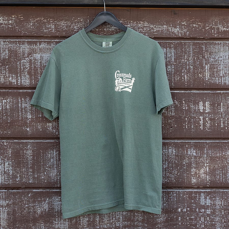 Show your support for local agriculture in style with the official Crossroads Farm Adult T-Shirt! This comfy tee features the Crossroads Farm logo and is perfect for farmers' market mornings or everyday wear. #farmfreshfinds