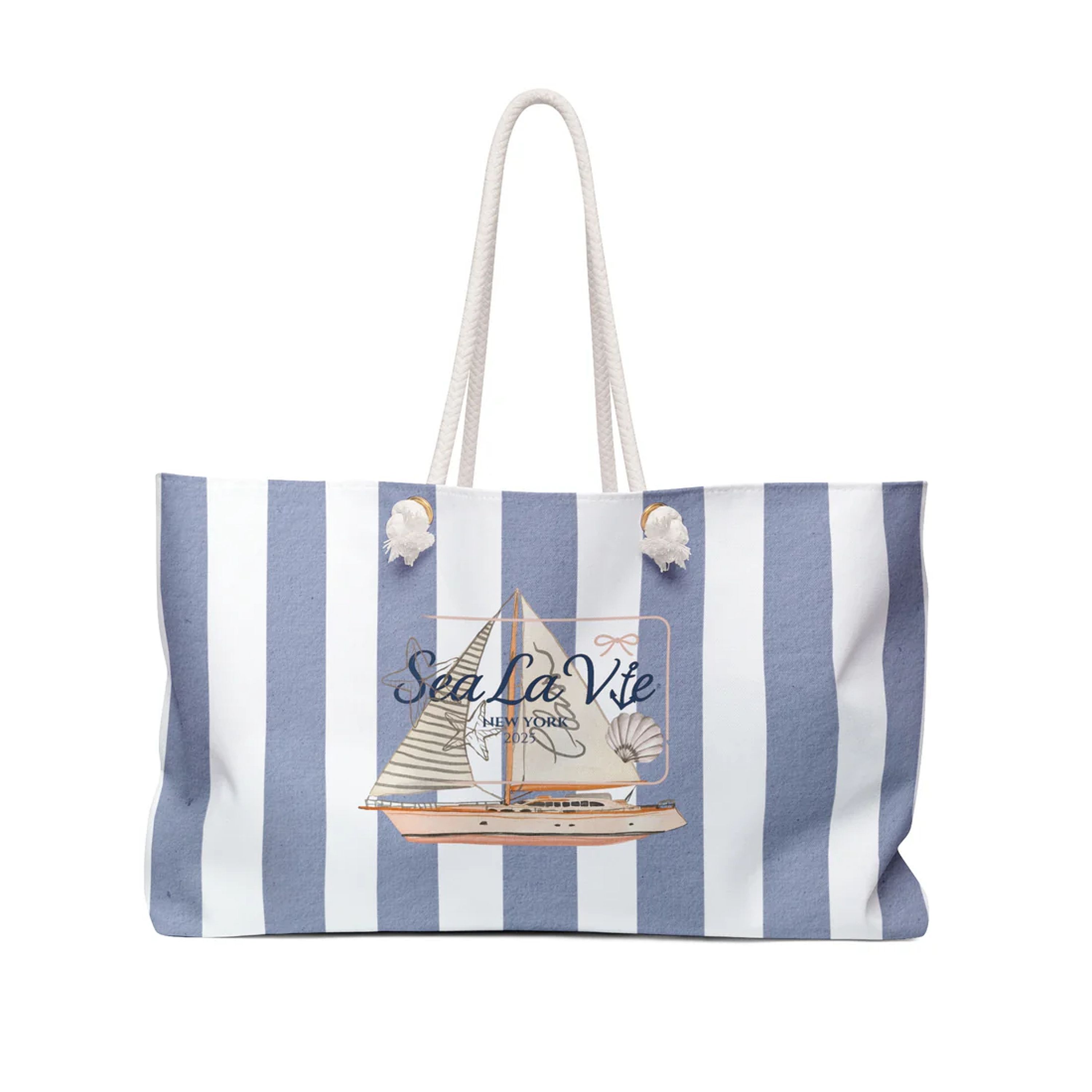 Our oversized Weekender Tote is perfect for your weekend at the beach or in town. The wide-mouthed, durable bag holds a generous amount of personal items and is easily held by its thick rope handles.
