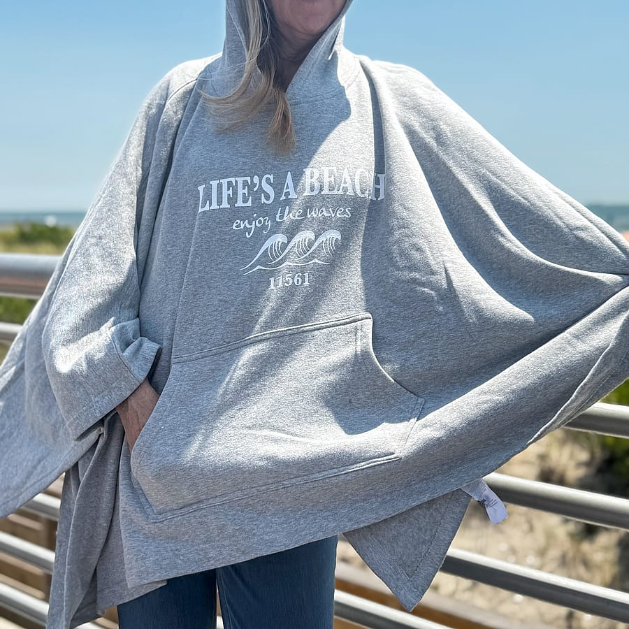 Life's A Beach, Enjoy The Waves. One size poncho hoodie. Color: Heather Grey #lisubscriptionbox Material: 55/45 cotton/polyester fleece. Features: Unlined hood. Front pouch pocket. Button tacked at armholes