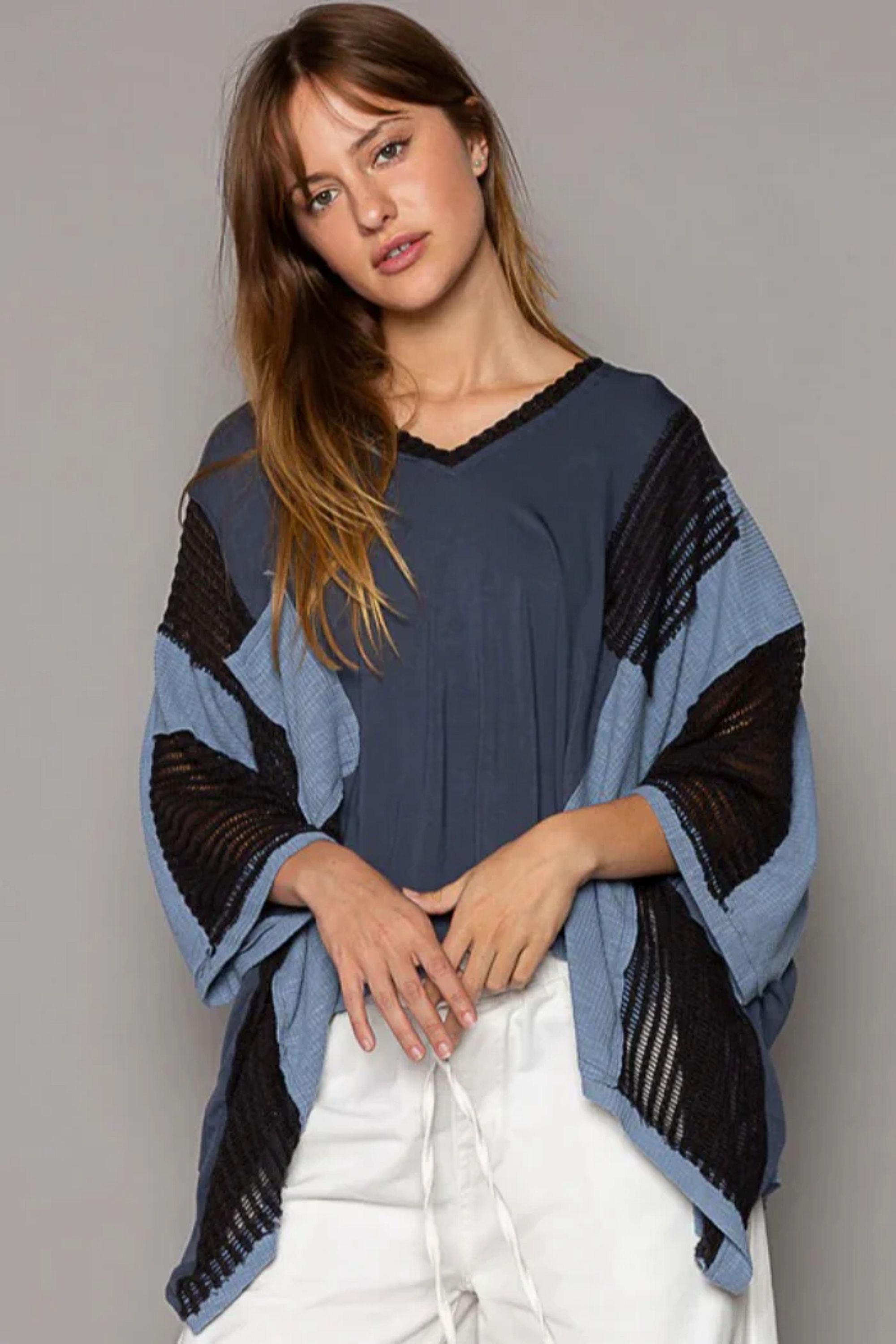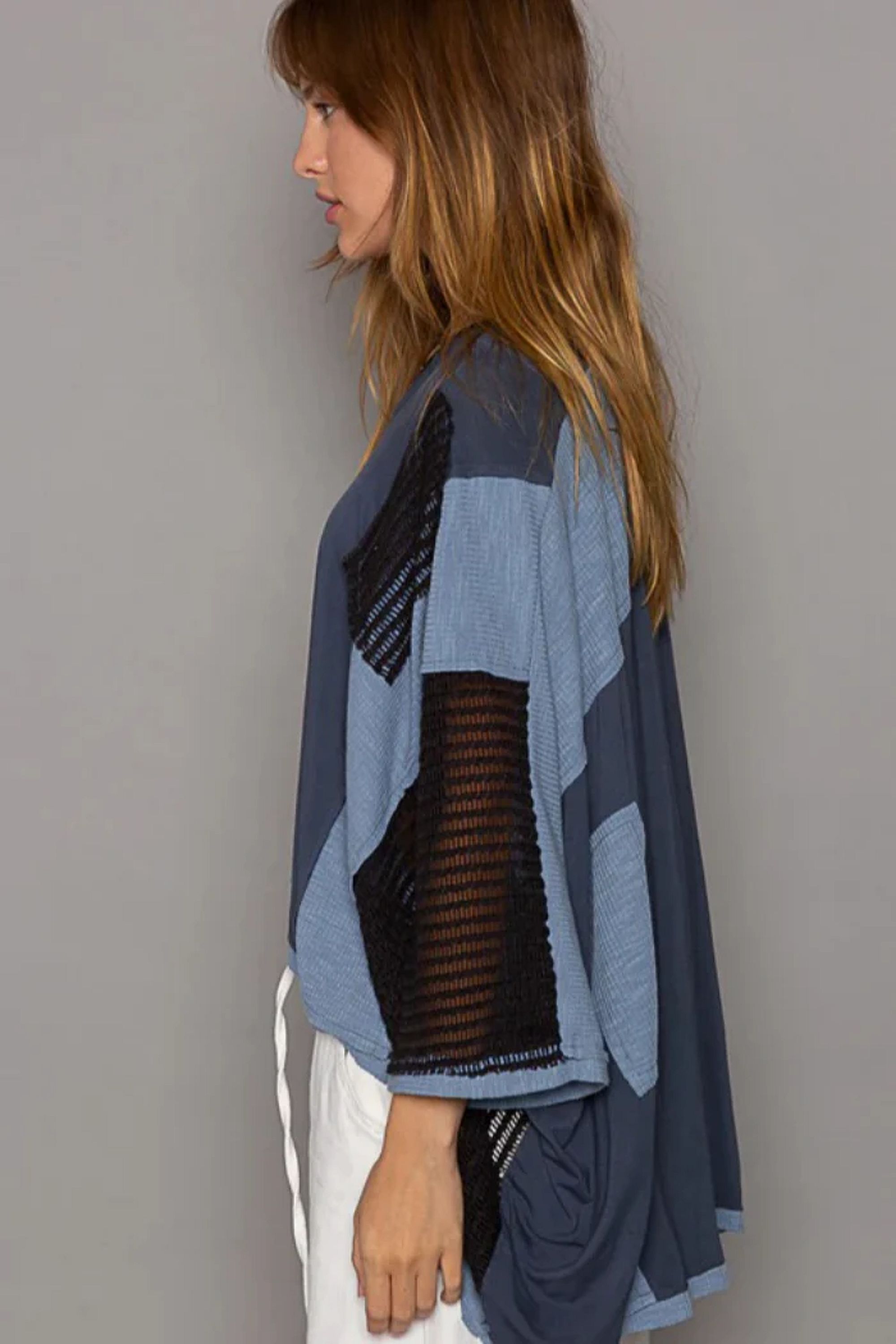Designed in V-neckline knit top, oversized fit, drop shoulder, see through fabric mixed, frayed edge detailing throughout the garments. featured in Pol's jersey. Self: 94% Rayon, 6% Spandex Contrast: 60% Polyester, 30% Rayon, 10% Spandex