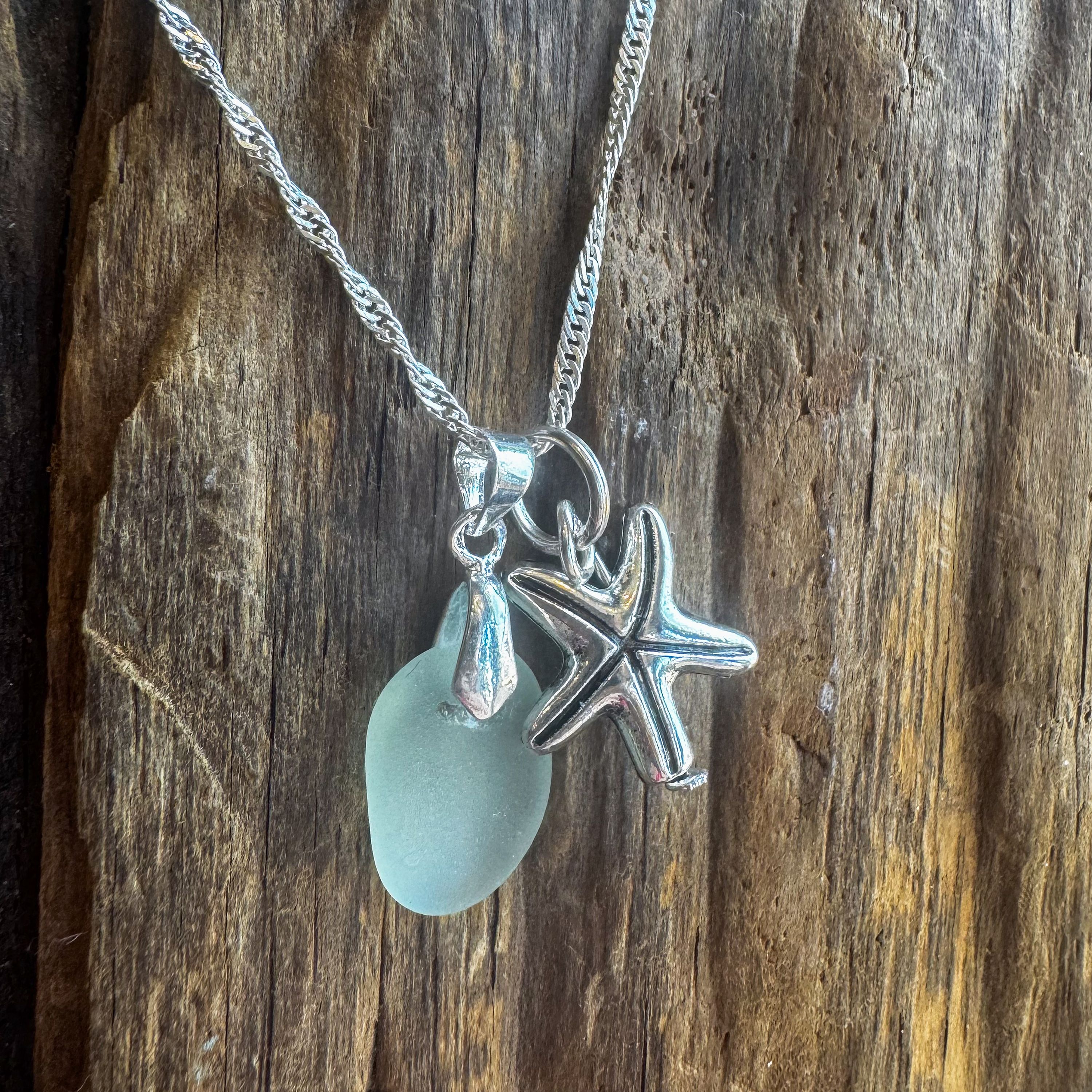 Make a splash with this eye-catching Chunky Starfish & Seaglass Pendant Necklace. Featuring a bold, polished starfish charm alongside a smooth, ocean-tumbled sea glass pendant, this necklace captures the beauty and strength of the sea in one stunning piece. Suspended on a silver-tone chain, it’s perfect for anyone who loves making a coastal-inspired statement.
