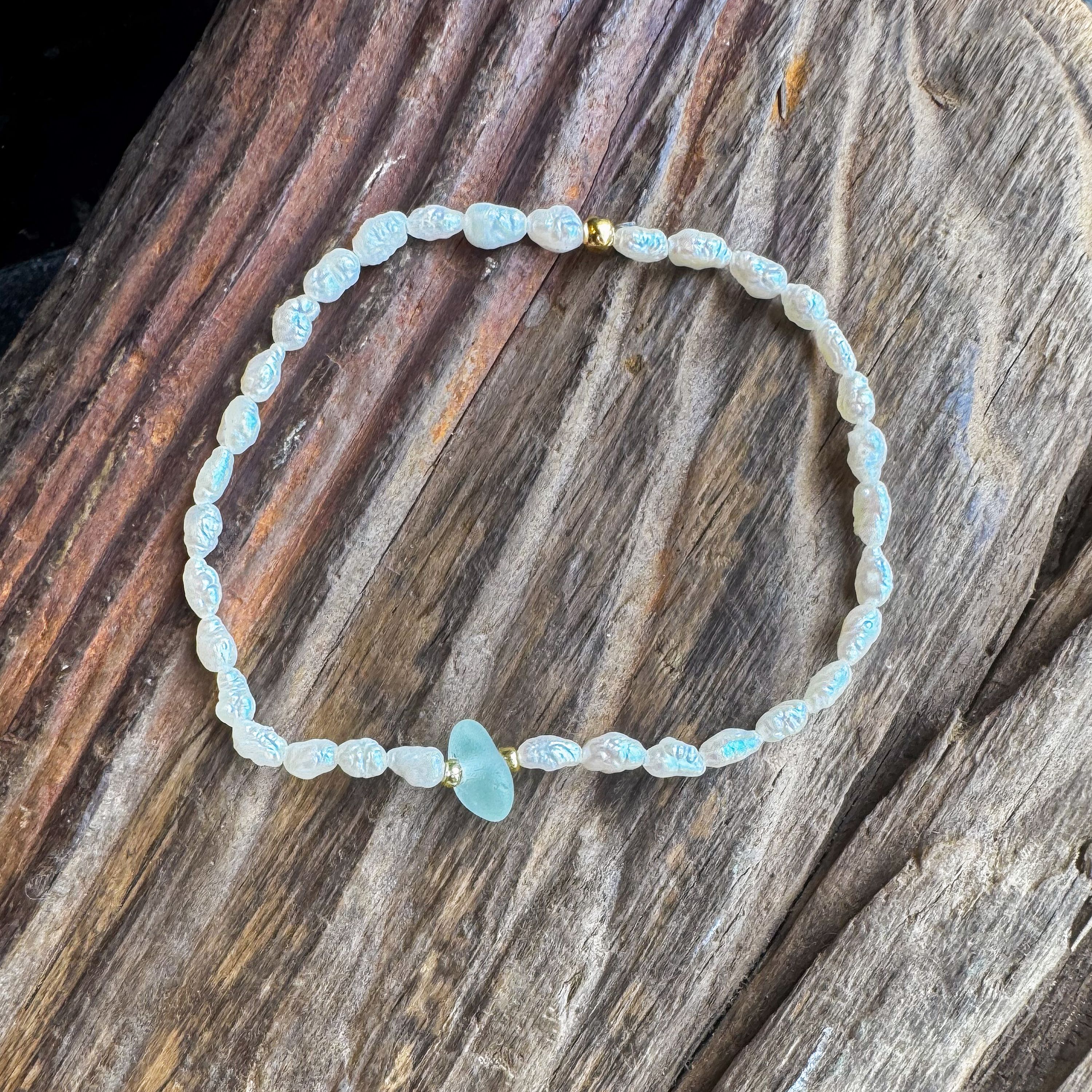 This delicate bracelet features a soft seafoam green seaglass centerpiece surrounded by intricately carved iridescent beads and finished with gold accents. Lightweight and full of ocean charm, it's the perfect piece for layering or wearing solo.