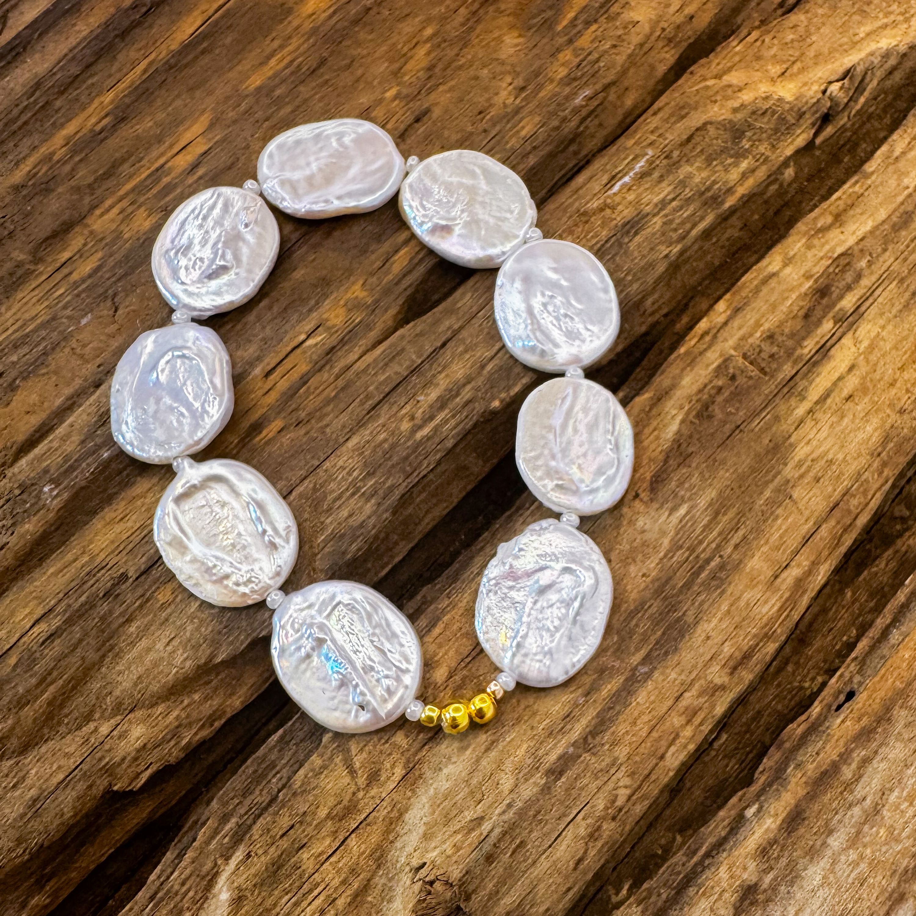 Elevate your coastal style with this stunning handmade bracelet. Featuring luminous, genuine coin-shaped freshwater pearls and accented with delicate gold and white beads, this piece captures the natural elegance of the sea with a modern twist.