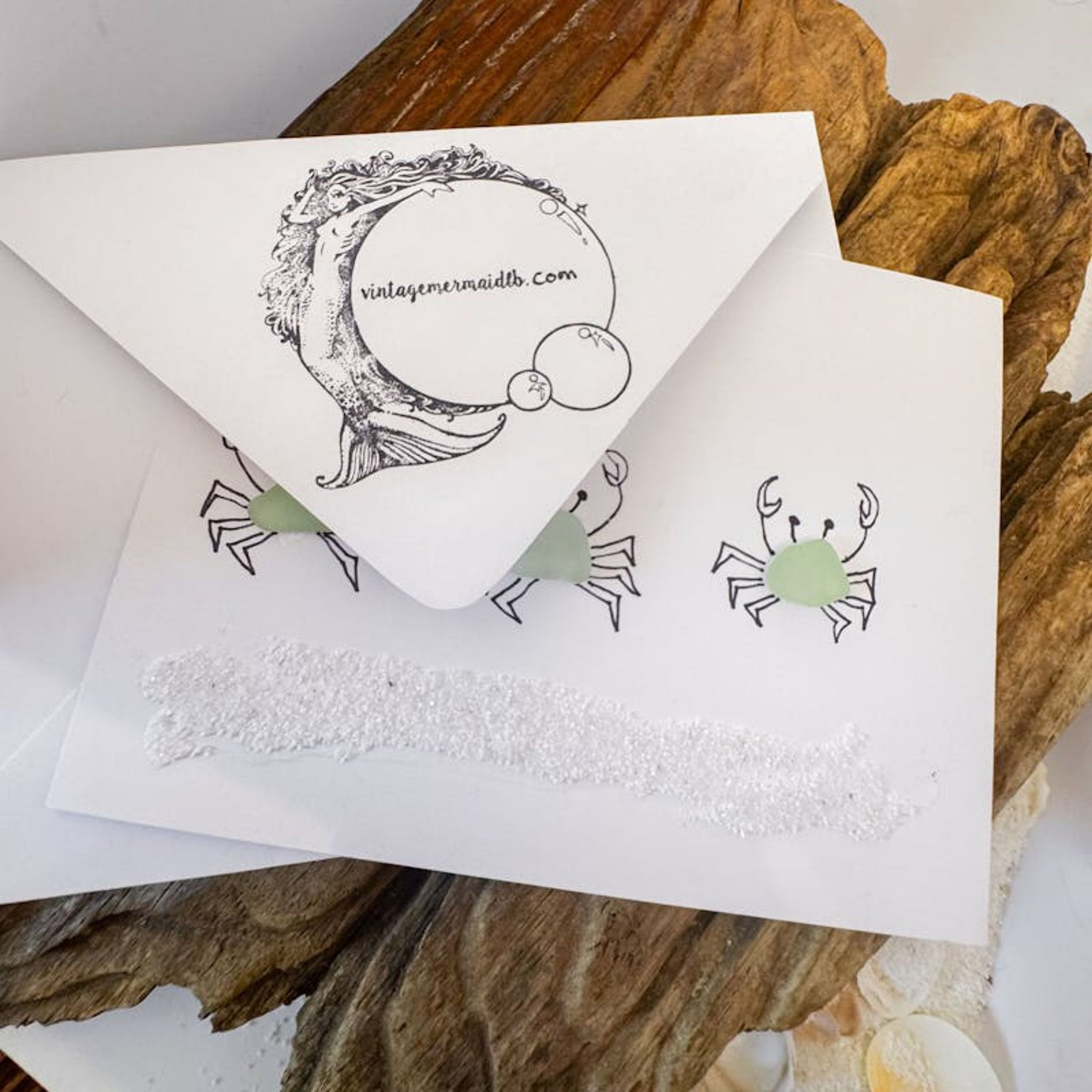 Handmade greeting card featuring three charming illustrated crabs with real seaglass bodies and a textured sand shoreline. This coastal-inspired card is blank inside for your message and beautiful enough to be framed as a keepsake.
