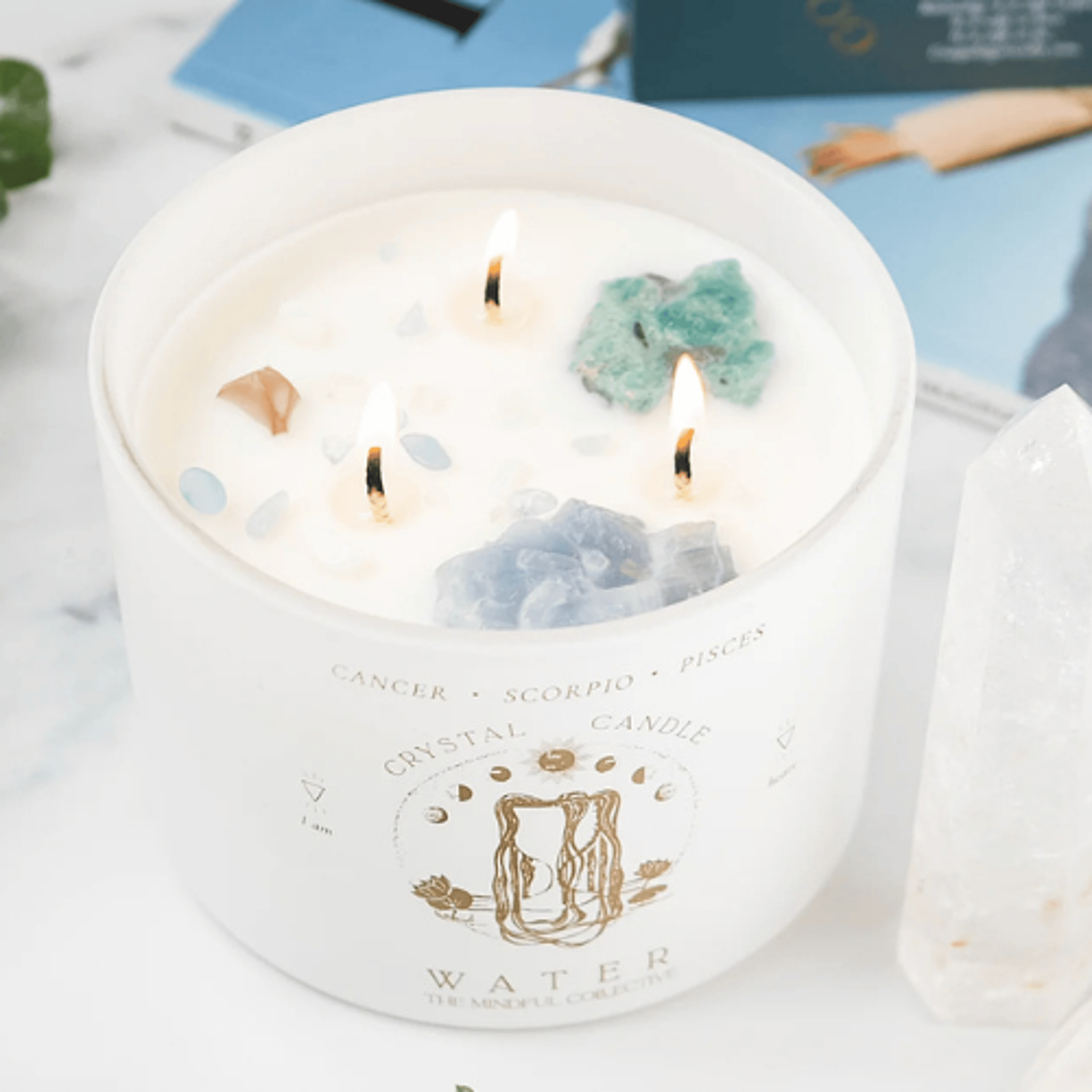 A 12oz Crystal Candle with Blue Calcite, Amazonite, and Clear Quartz. Made for Cancer, Scorpio, & Pisces Astrological Signs. Water Signs: You are here to explore the depths, to be and feel it all. Let this candle remind you that your softness is your superpower. Your Water Elements Candle Contains: * 100% Natural Soy Wax * 100% Cotton 3 Wick Candle * 3x Crystals - Blue Calcite, Amazonite, and Clear Quartz Point * Crystal Tumbles * Scent: A crisp blend of bergamot & mandarin notes * 12oz Candle