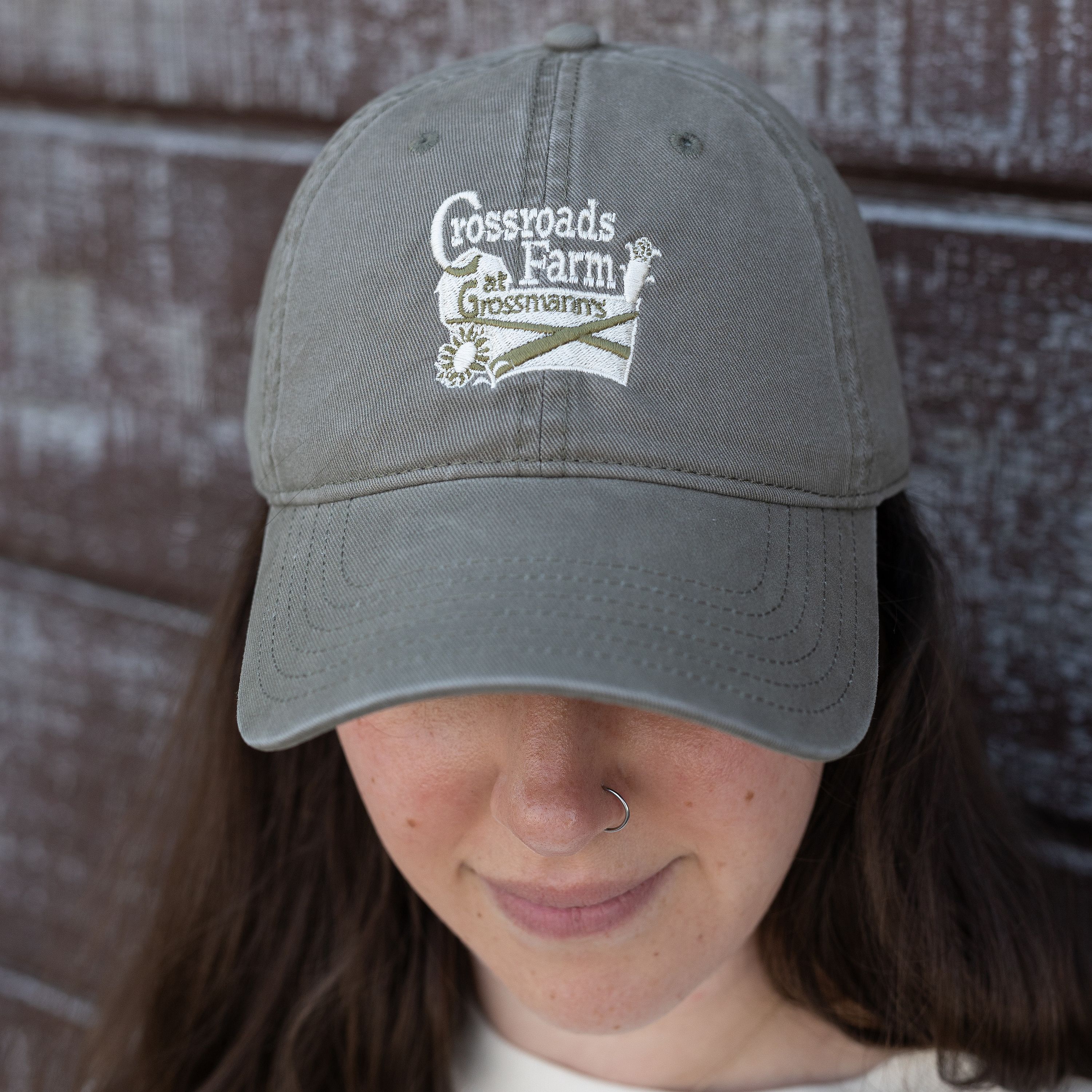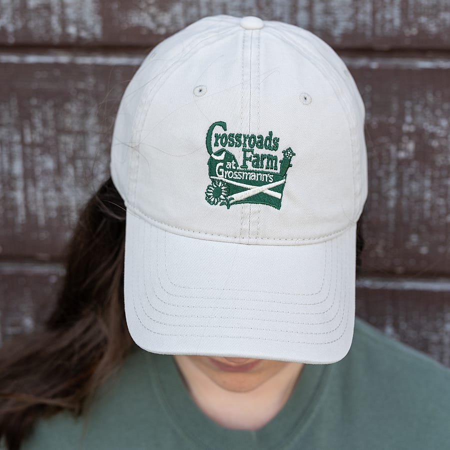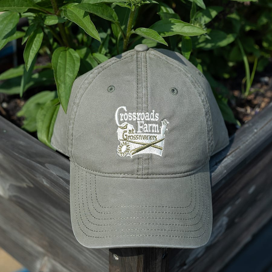 Show your support for local farming with the official Crossroads Farm at Grossmann’s cap! This classic hat features a curved brim, adjustable back strap, and durable cotton construction — perfect for sunny days on the farm or everyday wear. The front is embroidered with the Crossroads Farm logo and a sunflower and shovel graphic that captures the spirit of community, sustainability, and fresh local produce.