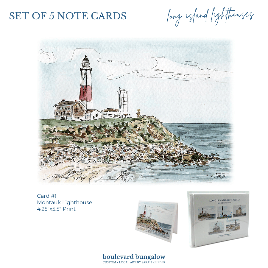 Send a touch of coastal charm with this set of 5 lighthouse note cards. Each features a delicate line drawing and watercolor of iconic Long Island Lighthouses, capturing their timeless beauty. Blank inside for your personal message, perfect for notes, gifts, or keepsakes.